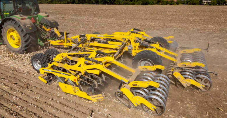 La machine est équipée de disques de 620 mm et 6 mm d’épaisseur soit de type crenelé ou gaufrés (plus agressifs). Chaque disque est monté sur son propre bras et a sa propre sécurité à ressort (horizontal, précontraint à 200 kg), pour un travail régulier même en présence de pierres ou résidus. Ils sont espacés de 25 cm et orientés en X pour un guidage est plus direct de la machine dans l’axe du tracteur. Avec un tel diamètre de disque, l’outil offre une grande polyvalence et peut travailler de 6 à 16 cm de profondeur.