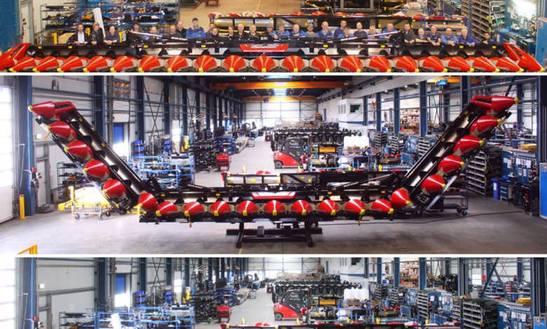 C’est le plus large que l’usine d’Ahlen ait construit de son histoire, ce cueilleur Corn Star 20 rangs compatible avec un inter-rang de 75 cm affiche une largeur impressionnante de 15,8 mètres. Il ne s’agit pas d’une bête de foire puisqu’il sera bientôt livré à un maïsiculteur sud-africain, qui semble ne pas avoir de problèmes pour se déplacer. Car bien que repliable, l’appareil affiche tout de même une largeur de 7,5 mètres une fois les extensions rabattues!