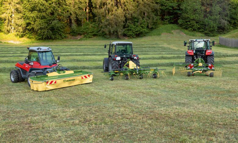 Pour les besoins des éleveurs situés dans les reliefs montagneux, Krone développe la gamme Highland composée de faucheuses, andaineurs et faneuses.