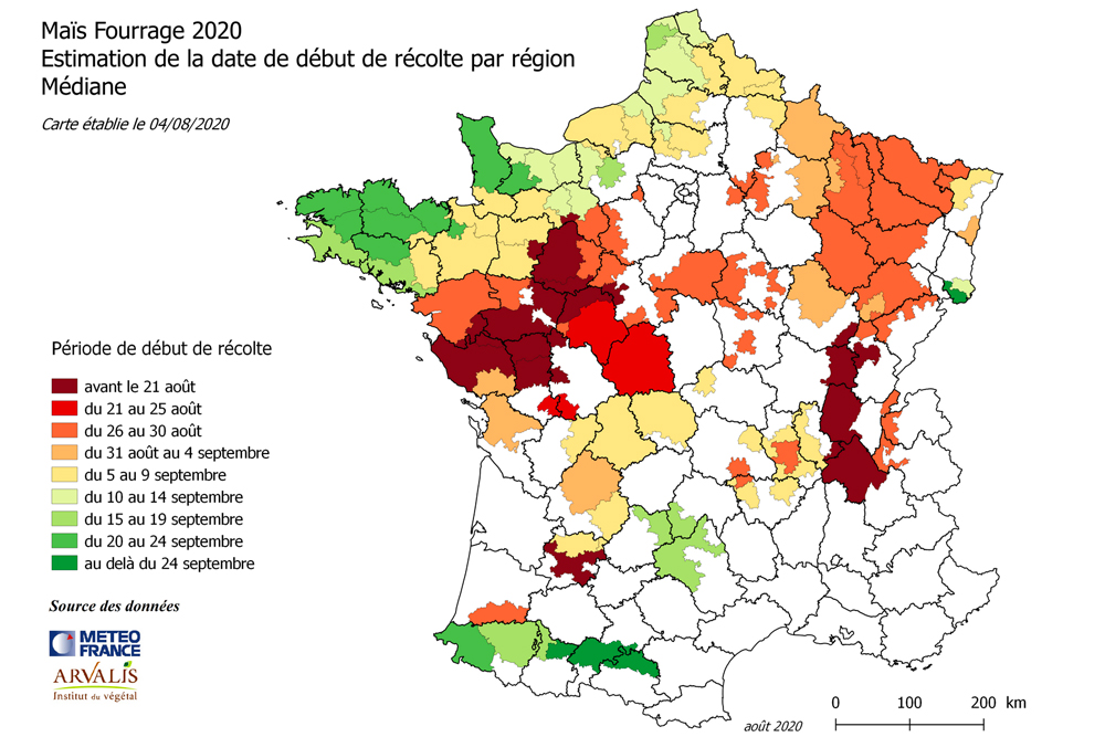 Pour chaque « région », les experts d’Arvalis ont défini le groupe de précocité dominant et la date médiane des semis en 2020. Avec les données météo de l’année en cours et les données statistiques sur les semaines à venir, il est possible de prévoir une période à laquelle le stade optimal de récolte, 32-33 % de matière sèche plante entière, sera atteint. Cette prévision est régulièrement mise à jour pour prendre en compte le climat de l’année. Afin d’étaler la période de chantier, et pour éviter les récoltes tardives à taux de matière sèche trop élevé, la carte propose une période de début de récolte par région.