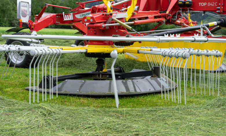 L’andaineur à dépose centrale TOP 842 C offre une largeur de travail de 7,7 à 8,4 mètres. La roue de jauge Multitast est par ailleurs également compatible avec le patin Flowtast et disponible en option.