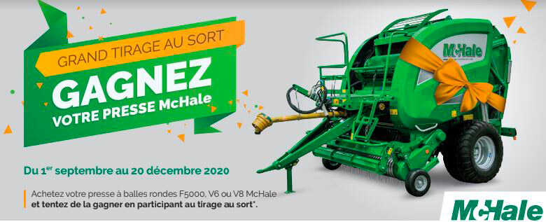 La société Sterenn Équipements organise du 1er septembre au 20 décembre 2020, chez les revendeurs agréés participants situés en France métropolitaine, un jeu avec obligation d’achat qui permet dans le cadre d’un tirage au sort contrôlé par un huissier de justice de gagner une presse à balles rondes neuve de marque « McHale » ou le prix d’achat correspondant à celle-ci. L’opération est réservée aux personnes physiques ou morales qui remplissent cumulativement les conditions suivantes :