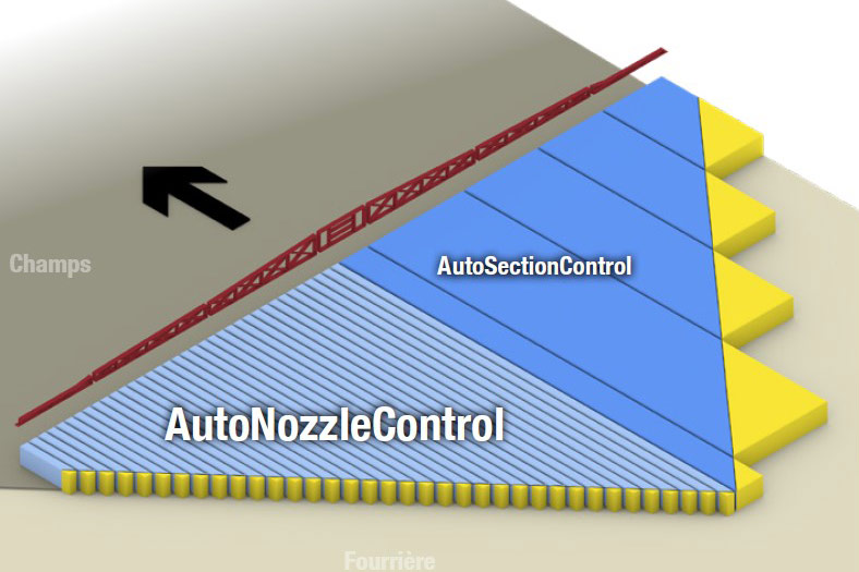 - Equipée de la Circulation continue PrimeFlow, l’activation « AutoSectionContol » permet une coupure buse à buse qui limite le chevauchement en pulvérisation et conduit à des économies de produits chimiques jusqu’à 5%