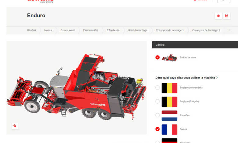 Ceux qui ont visité le stand virtuel « Dewulf Xpo » l’année passée ont eu l’opportunité de configurer de A à Z une demi–douzaine de machines. C’est principalement la Dewulf Enduro, l’arracheuse par tamisage automotrice à 4 rangs sur pneus, qui servi de cobaye à la firme, avant de lancer officiellement sa plate–forme https://machines.dewulfgroup.com.