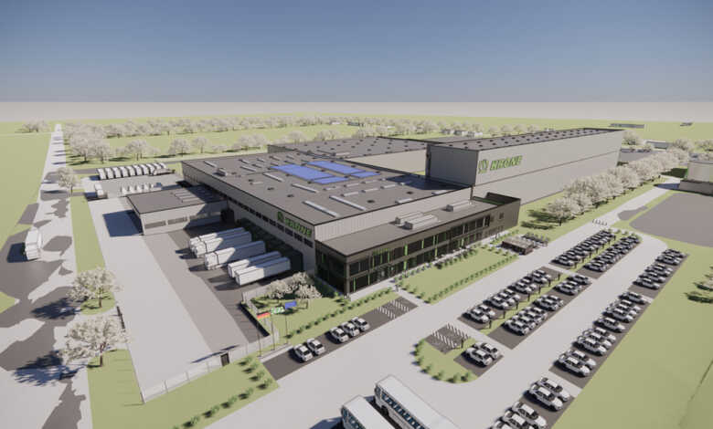 D’une surface de 7,5 hectares, ce nouveau site situé à l’entrée de la ville de Spelle, où siège le constructeur allemand comprendra un bâtiment de stockage des pièces de rechange ainsi qu’un centre logistique attenant, intégrant une partie bureaux.
