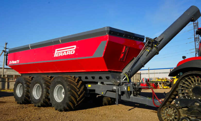 Ces appareils aux dimensions américaines affichent une largeur sur route de 3,5 mètres avec six pneumatiques 750/60R30.5 en standard, et bien au delà avec des pneumatiques de 1050 mm de largeur, et une hauteur de 3,8 à 4,15 m (4,8 m au déchargement) ce qui limite leur utilisation sur nos routes et leur intérêt agronomique lors de récoltes délicates. Pour autant ils reprennent les particularités de la gamme X-Flow commercialisée dans l’Ouest de l’Europe et limitée à 34 m3 avec une vis de déchargement de gros diamètre à l’avant, avec pesée électronique optionnelle. Rappelons que Perard s’est aussi distingué sur ce marché par des transbordeurs plus polyvalents, les Interbenne. Capables de décharger directement dans une fosse grâce à la position de sa vis, ils peuvent également transborder des engrais corrosifs grâce à leurs vis inoxydables. Ceux-ci sont proposés sur notre marché de 27 à 52 m3 en deux à trois essieux tandis que le X-Flow s’envisage de 15 à 34 m3 de 1 à deux essieux.
