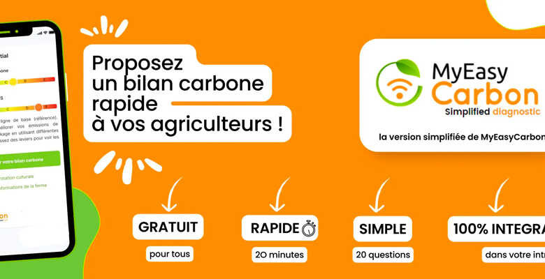 Depuis Juillet 2022, MyEasyFarm propose une version simplifiée de MyEasyCarbon : MyEasyCarbon Simplified Diagnostic. Disponible en ligne, il permet aux agriculteurs en Grandes Cultures de réaliser rapidement et gratuitement un bilan carbone simplifié de leur exploitation agricole. Le résultat du test indique sur une échelle de graduation la situation carbone en termes d’émissions de GES et de stockage carbone de l’exploitation.