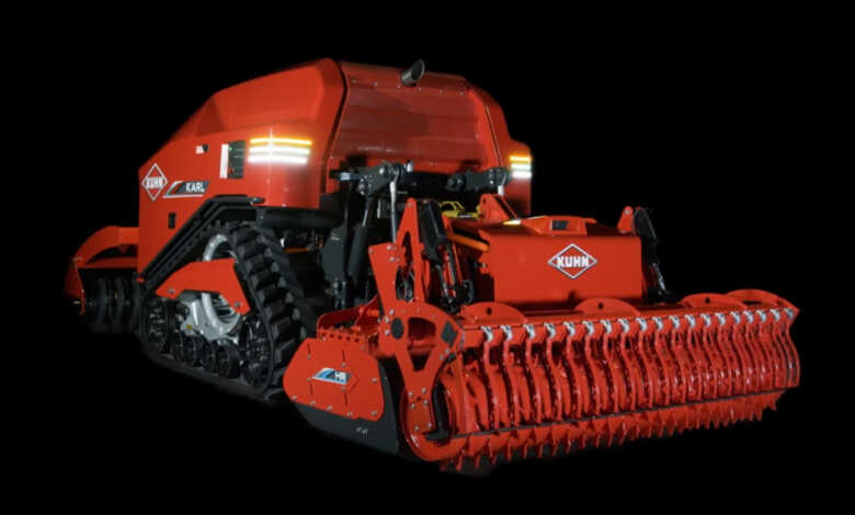 En juillet dernier, Thierry Krier, PDG du groupe avait indiqué qu’il sera bien plus qu’un robot. On ne sait pas encore ce que l’appareil nous réserve en terme d’efficience et d’automatismes . Premier détail que vous aurez remarqué, le pot d’échappement central révèle l’usage d’un moteur thermique pour se mouvoir. Quid de la transmission, hydraulique ou électrique? Rendez-vous à Agritechnica pour le savoir. On peut également voir que l’appareil chenillé profite de deux relevages pour une combinaison d’outils et un meilleur équilibre des charges.