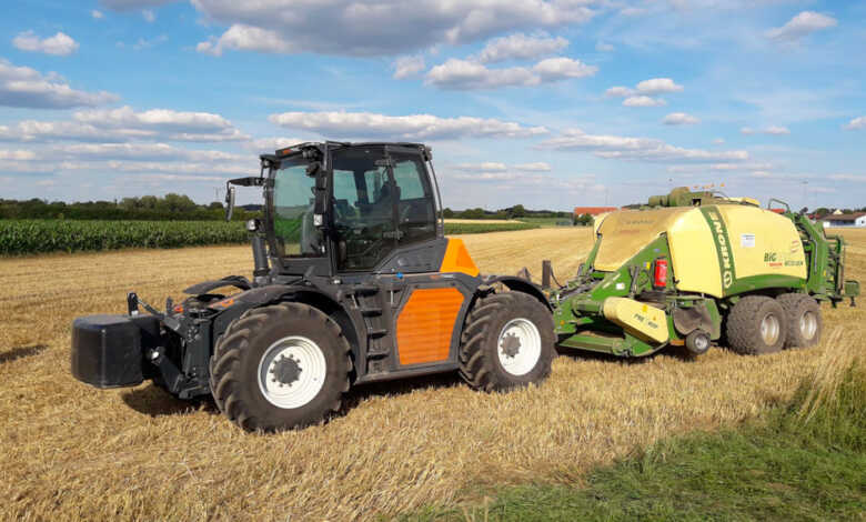 Atypique, le Syn Trac l’est. Il est aussi très novateur. Car au delà de son profil de porte-outils multifonctions, l’appareil de 420 chevaux présente plusieurs originalités qui le distinguent d’autres quatre roues directrices à châssis rigide commercialisés sur le marché. Présenté dans sa version aboutie à Agritechnica en novembre 2017, l’appareil peut recevoir un essieu moteur supplémentaire, non seulement pour améliorer sa traction, mais également s’affranchir des règles en matière de poids admis par essieu, sur route. Second point distinctif, son système d’attelage/dételage automatisé des outils avant et arrière. Enfin, un chargeur frontal dédié, qui présente une cinématique unique sur ce segment.