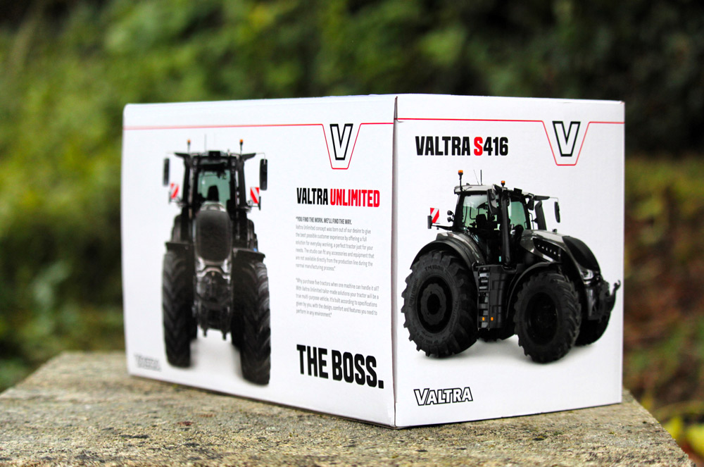 Cette couleur grise avec une légère nuance métallisée adjointe à des jantes noires donne un aperçu de ce que le studio unlimited Valtra est capable de faire à l’échelle 1. Pour cette première réplique au 1/32, UH propose une série limitée de 1.000 pièces fournie en boite Valtra blanche avec la photo du vrai tracteur de face et de profil.