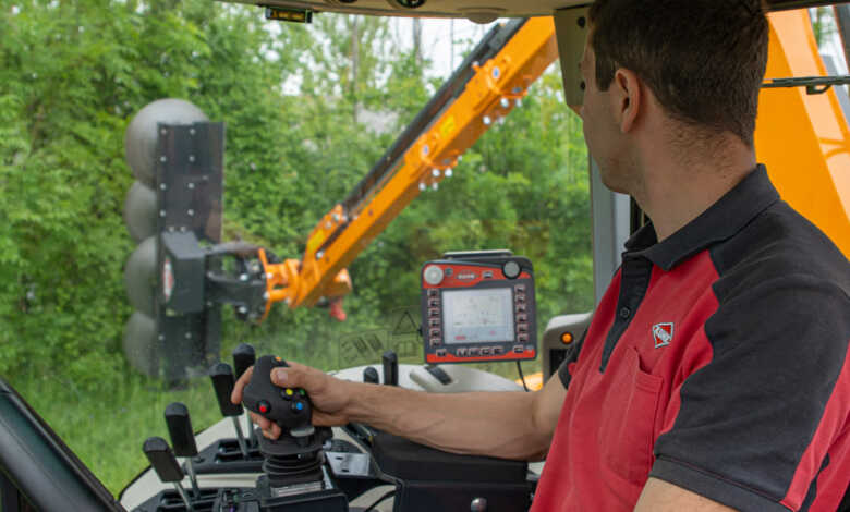 La fonction e-Assist consiste en l’instrumentalisation des vérins hydrauliques du bras des faucheuses débroussailleuses tout en les mettant en relation avec une intelligence électronique pour profiter de nombreux automatismes. Dans la pratique, ces automatismes maintiennent, quelle que soit la portée du bras, un angle constant de la tête de coupe pendant le travail. Il suffit donc d’actionner un seul mouvement au niveau de la commande Ergonomics’ pour décrire deux mouvements au niveau du bras. Lors des chantiers d’élagage sur des pans verticaux ou des pans horizontaux, les mouvements décrivent un parallélogramme, et améliorent par conséquent la précision de travail.