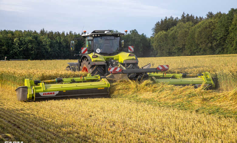 Le délestage de la faucheuse Active Float de série peut être adapté aux conditions de récolte via le terminal ISOBUS (Cemis 700, Cemis 1200 ou celui du tracteur) à tout moment pendant le travail afin de toujours travailler avec une pression d’appui au sol la plus faible possible et donc de ménager le fourrage, le matériel et les efforts. Le système automatique de dévers Claas en option pilote la pression d’appui au sol lors du fauchage en dévers latéral de manière différente en amont et en aval afin de réduire au maximum la traction latérale et donc le décalage entre la faucheuse frontale et la faucheuse arrière. De plus, cette forme d’assistance électronique au conducteur permet de travailler en dévers en ménageant la couche végétale, surtout dans des conditions de forte humidité du sol.