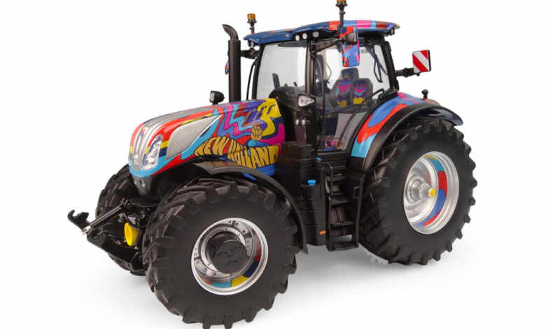 Les graphismes qui ornent le porte-étendard de l’usine anglo-saxonne célèbrent l’époque à laquelle l’usine de Basildon a été fondée, s’inspirant de la décennie des années 1960, qui a vu tant de progrès technologiques. Créée par CNH Centro Stile, la livrée de l’édition anniversaire s’inspire des couleurs et des motifs du « Swinging ’60s » de Londres, avec des formes psychédéliques caractérisées par des couleurs vives et fluides de bleu, jaune, marron et rose autour du logo distinctif de New Holland en forme de feuille jaune vif sur le capot. Le tracteur dévoilé lors de l’événement de célébration du 60e anniversaire de Basildon le 9 avril dernier, produit à un seul exemplaire, a naturellement droit à sa réplique échelle réduite, elle commercialisée à 1.500 exemplaires. Et c’est Universal Hobbies qui s’y colle avec une série spéciale vendue chez les spécialistes autour de 85,90€ TTC.