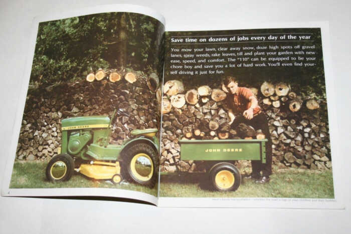 Le 110 comportait également des caractéristiques de sécurité inédites dans ce domaine, y compris le système de démarrage. La fonction exigeait que le levier de vitesses du tracteur soit au point mort et que le plateau de tonte soit désengagé avant que le moteur ne puisse démarrer. Avec le 110, John Deere met la barre haute face à la concurrence et propose une gamme complète d’outils allant de la fraise à neige, la lame frontale, le cultivateur à dents animé ou encore la charrue. S’il n’est disponible qu’en deux roues motrices, le 110 est chaussé soit de pneumatiques au profil gazon peu agressif ou agraire, pour les travaux de traction. Des chaînes viennent apporter de la motricité lorsqu’il est utilisé au déneigement.