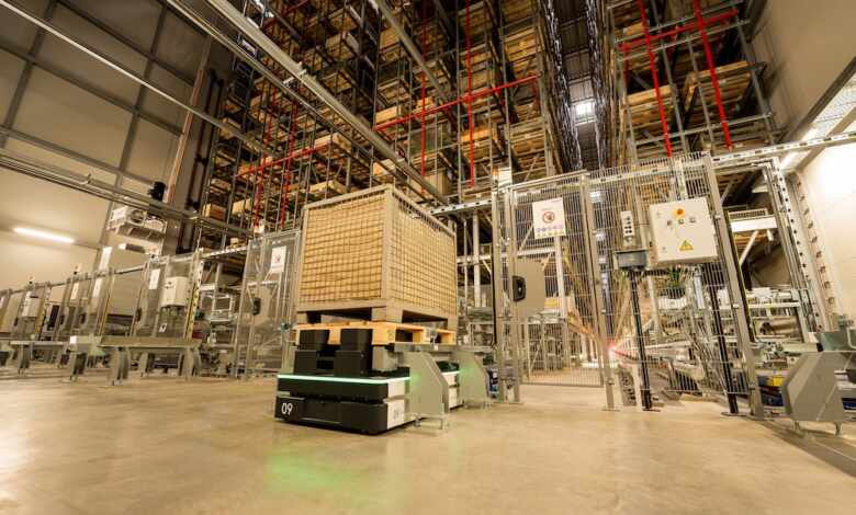 Ce nouvel outil répond à de nouveaux défis, tels que la pénurie de main-d’œuvre qualifiée, tout en augmentant la performance grâce notamment à de toutes nouvelles solutions d’automatisation de pointe. Pour cela, l’entrepôt comprend un espace de stockage d’une superficie de 3.588 m2 réservé à des hauts rayonnages (hauteur de 25 mètres – équivalente à celle d’un immeuble de huit étages – et d’une longueur de 155 mètres) divisés en trois allées. Chacune a son propre robot « transtockeurs » de palettes, qui atteint des vitesses de 3 m/s, assurant ainsi un flux de marchandises efficace, à savoir que 21 % des pièces expédiées par le Centre proviennent de cette zone. L’innovant système « Under Pallet Carrier », composé de dix robots de transport de palettes autonomes, permet d’alimenter l’entrepôt à hauts rayonnages ou d’en sortir des palettes et les acheminer vers les opérateurs en zone de préparation, optimisant ainsi le flux interne des pièces. Pour les pièces de grande taille, Krone a opté pour un bâtiment non isolé de 8.652 m² , pour éviter de chauffer inutilement des zones non pertinentes, complété d’une zone d’entrée et de sortie de marchandises de 7.865 m² ainsi que d’un magasin à ciel ouvert d’environ 6.000 m².