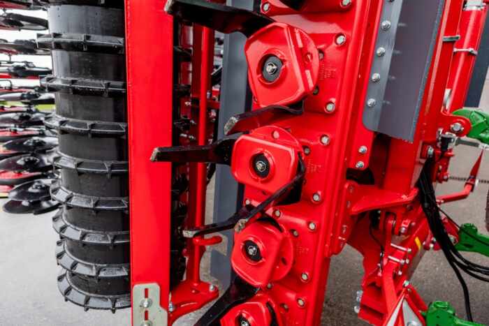 Comme les autres modèles équipés de la herse Kredo HD, les Versa 4 et 6 SL reprennent les fondamentaux, à savoir un caisson profilé fermé de 8 mm d’épaisseur, 20 rotors (modèle 6 mètres) pour un dégagement optimal même dans les sols pierreux, des porte-dents largement dimensionnés disposant de paliers supérieurs de 60 mm et de pallier inférieur de 70 mm, une puissance maximale admissible pour pouvoir être emmené par des tracteurs de 400 chevaux, une lame de nivellement fixée sur le cadre du rouleau évitant son réajustement lorsque la profondeur de travail est modifiée et des dents à changement rapide disponibles en version standard, Endurance (pastilles carbure) ou attaquantes. Les herses Kredo HD sont dissociables de la rampe de semis pour un maximum de polyvalence.