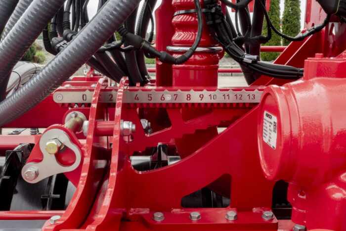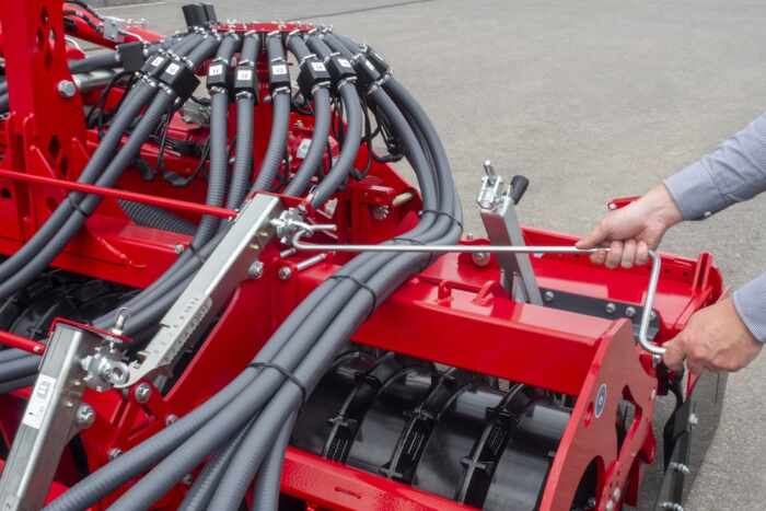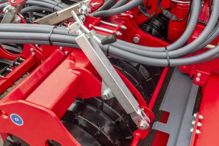 Lorsque les conditions de semis changent, les réglages doivent pouvoir être modifiés rapidement et aisément sans outils afin d’obtenir un positionnement précis de la semence dans le sol. Ainsi la profondeur de semis et la pression appliquée sur les éléments semeurs s’ajustent indépendamment l’une de l’autre et de manière centralisée de chaque côté du combiné. Ces opérations sont réalisées à l’aide de manivelles fournies avec la machine pouvant également servir au réglage de la herse rotative.