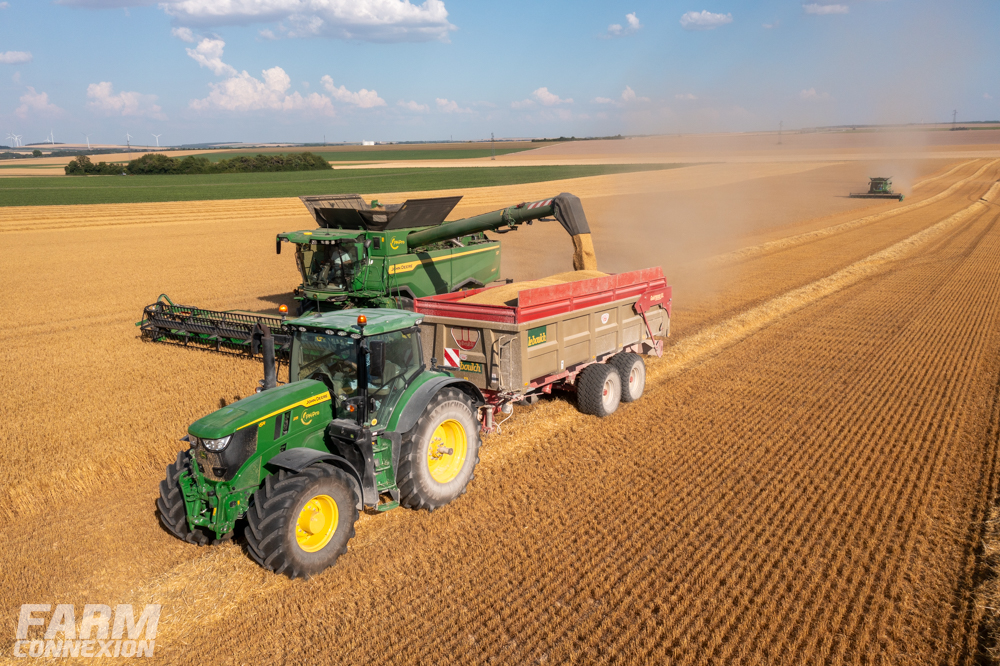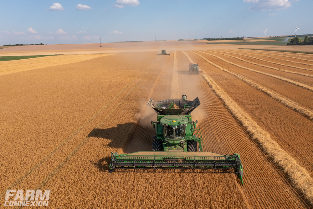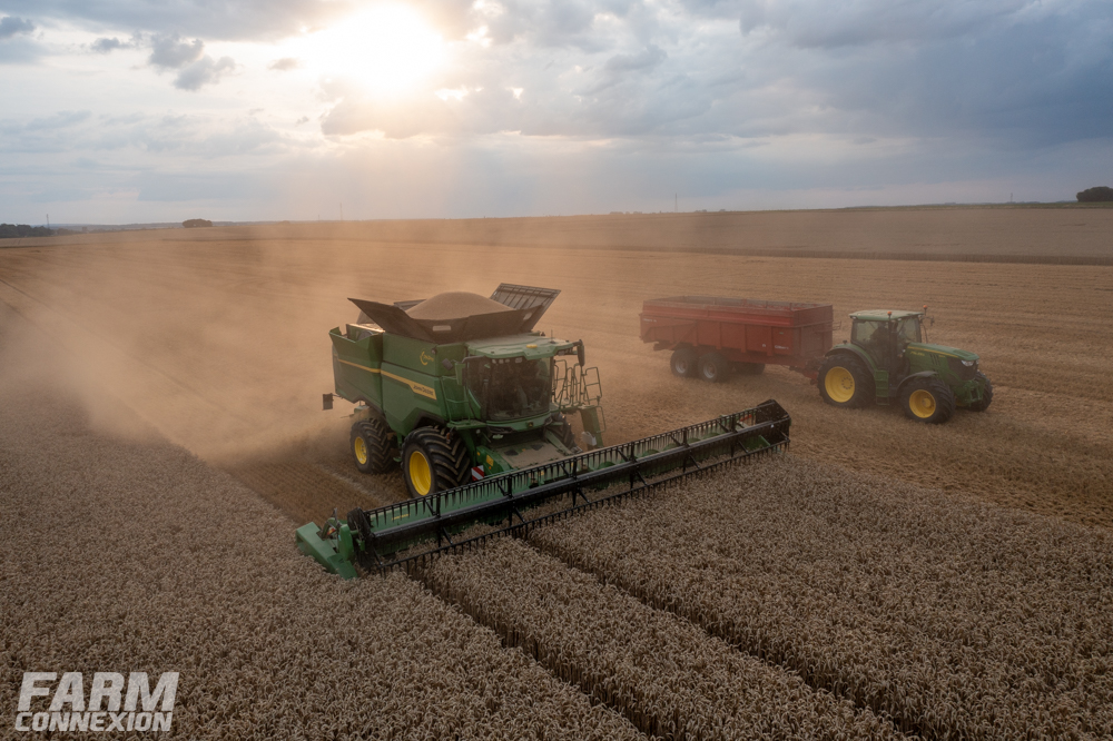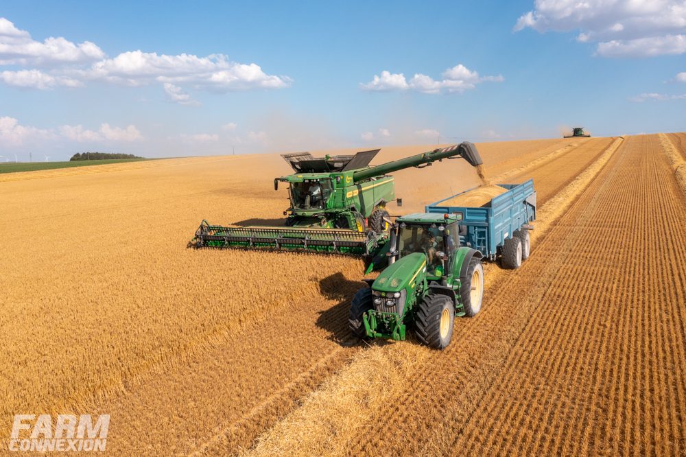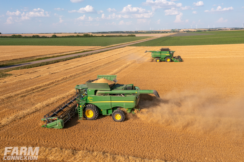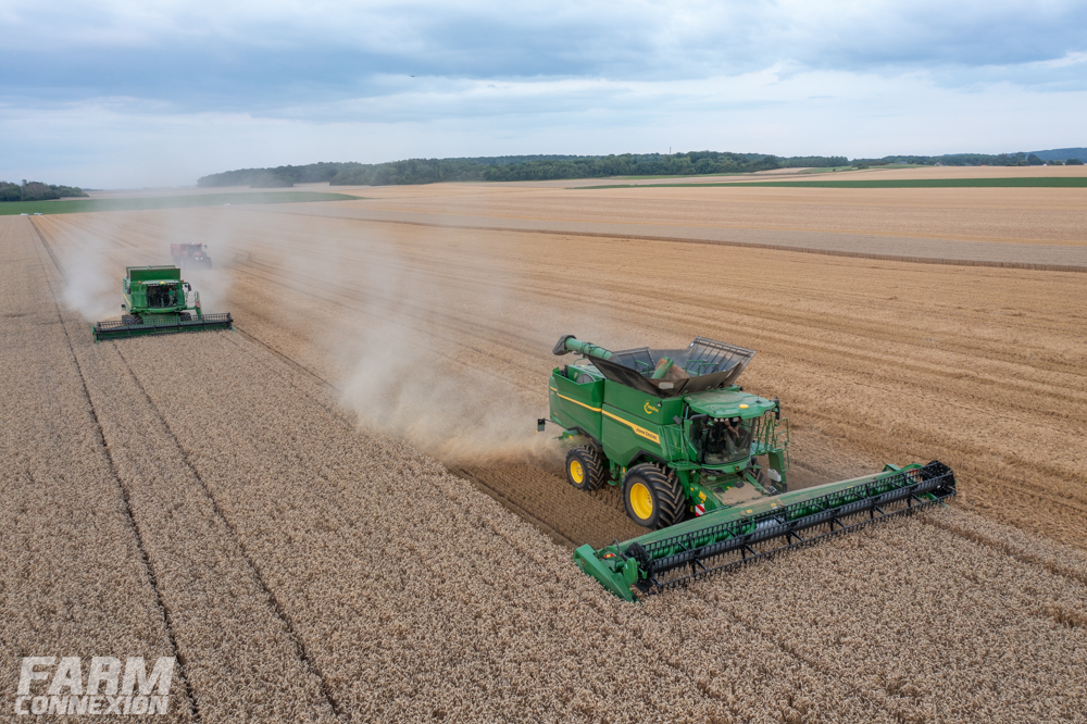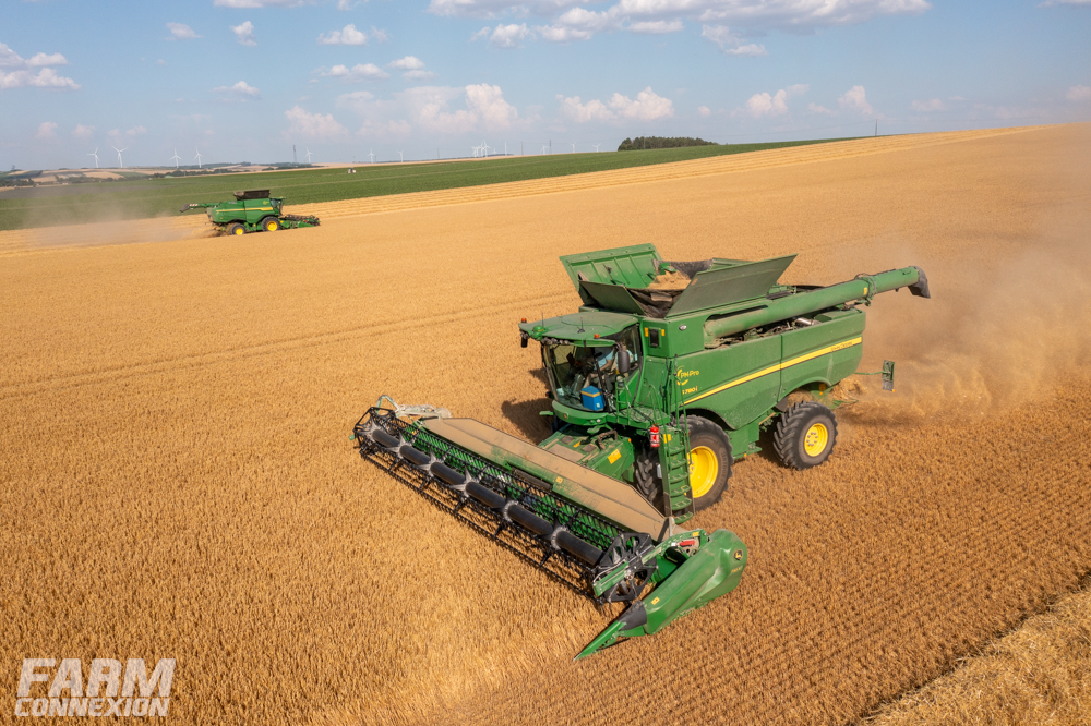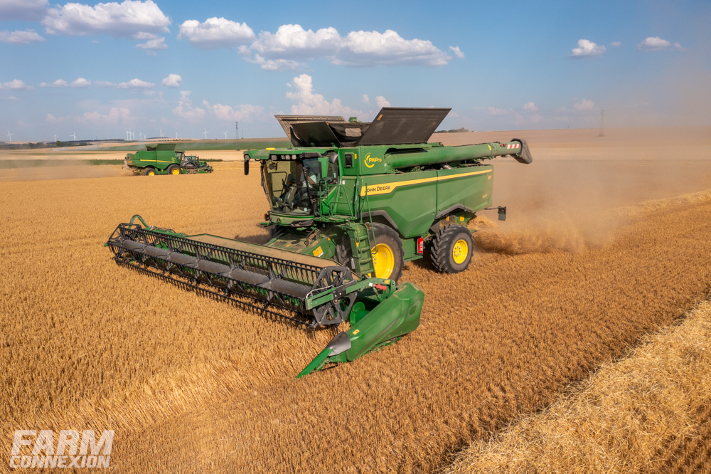 John Deere S7.800, dotée de sa coupe à tablier avancé XA30 de 9,2 mètres, accompagnée de sa devancière, la S780.