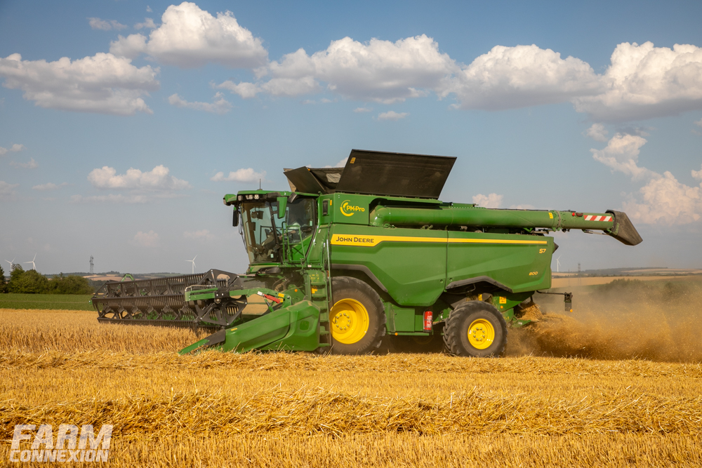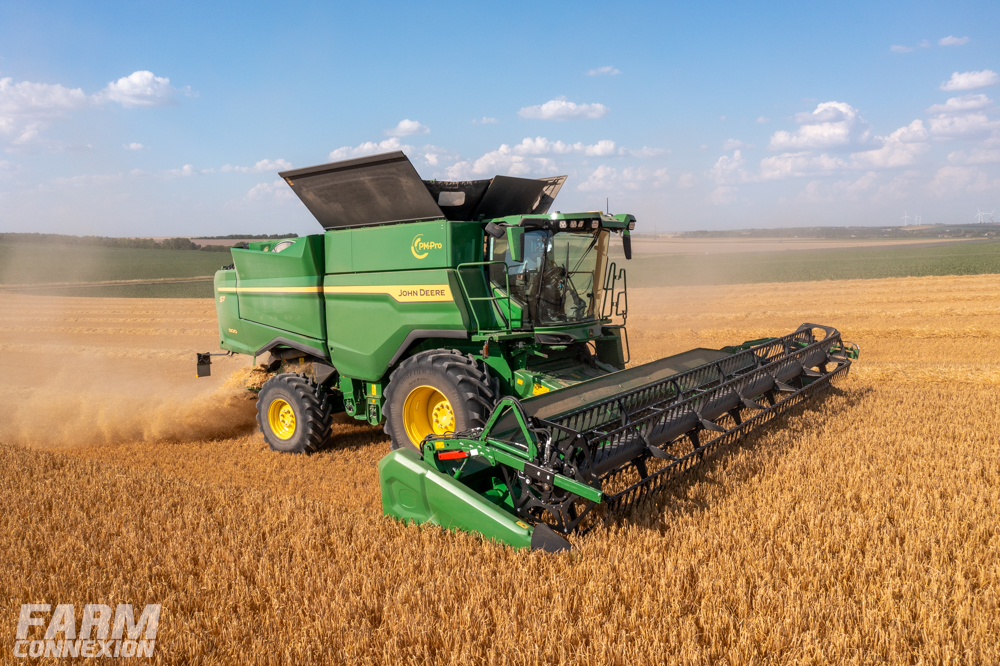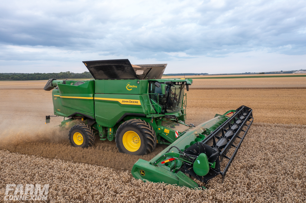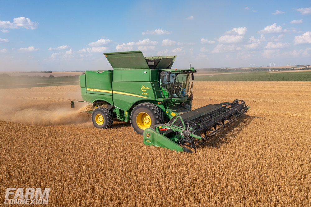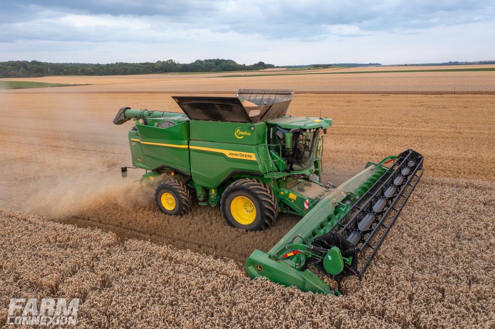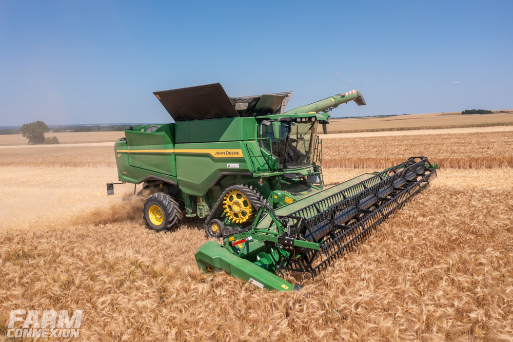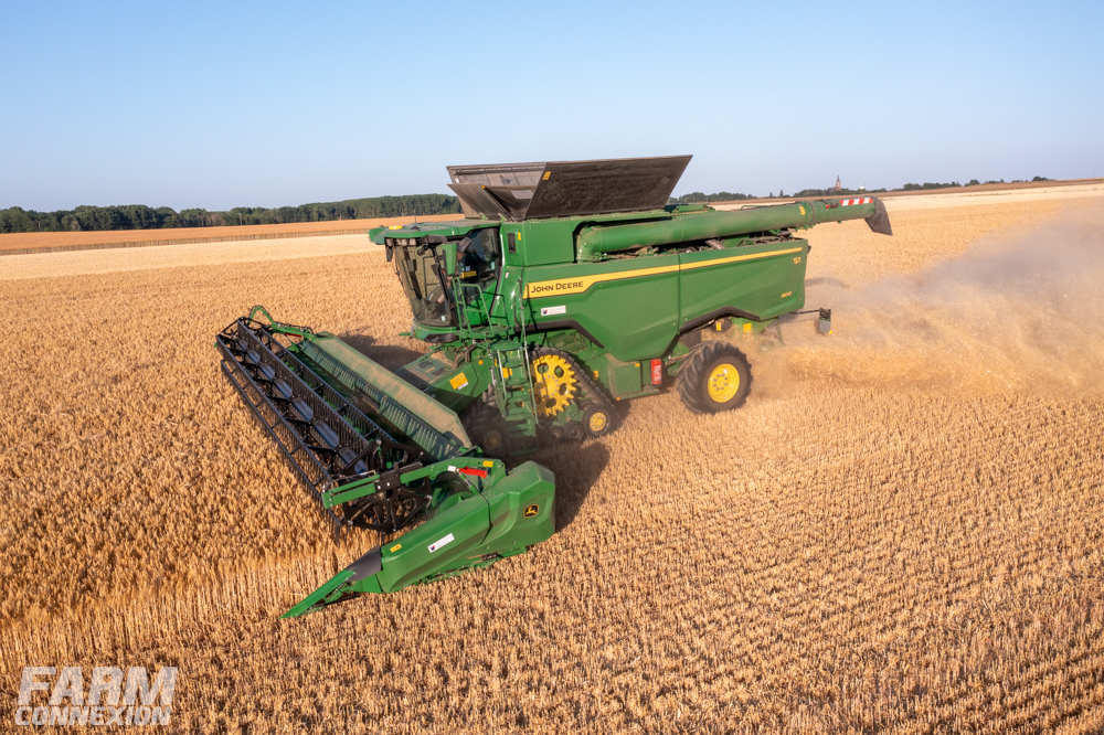 John Deere S7.850, dotée de sa coupe à tablier avancé XA35 de 10,7 mètres.