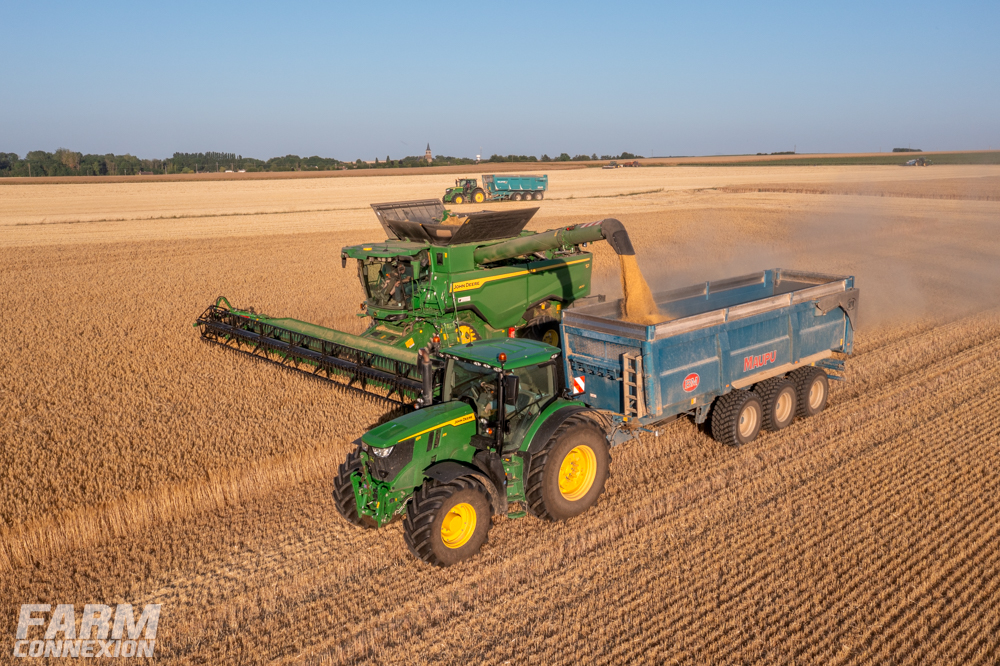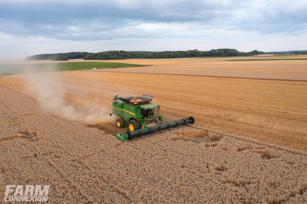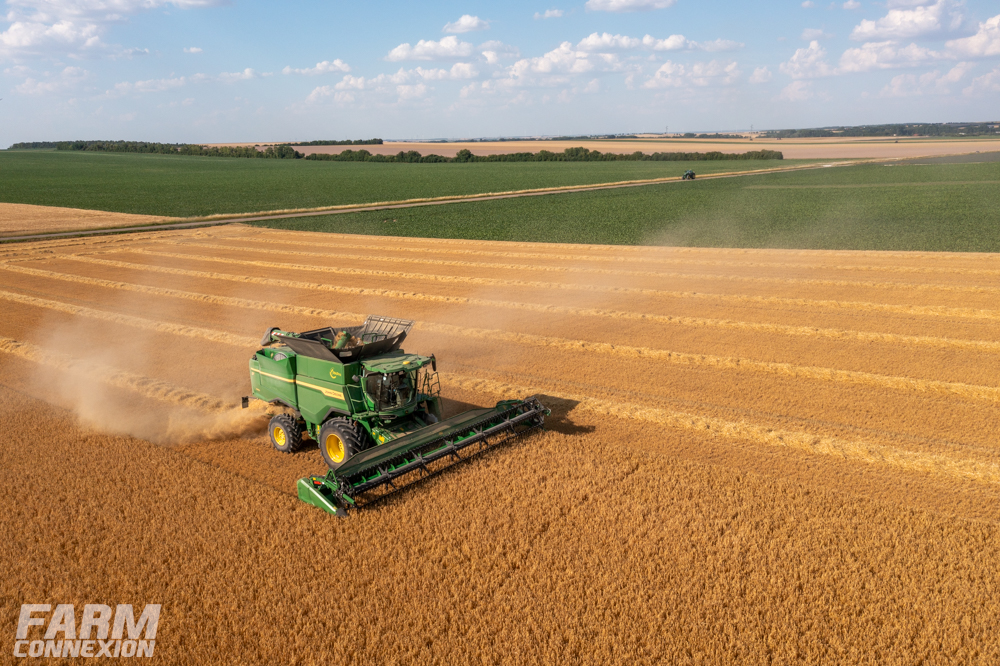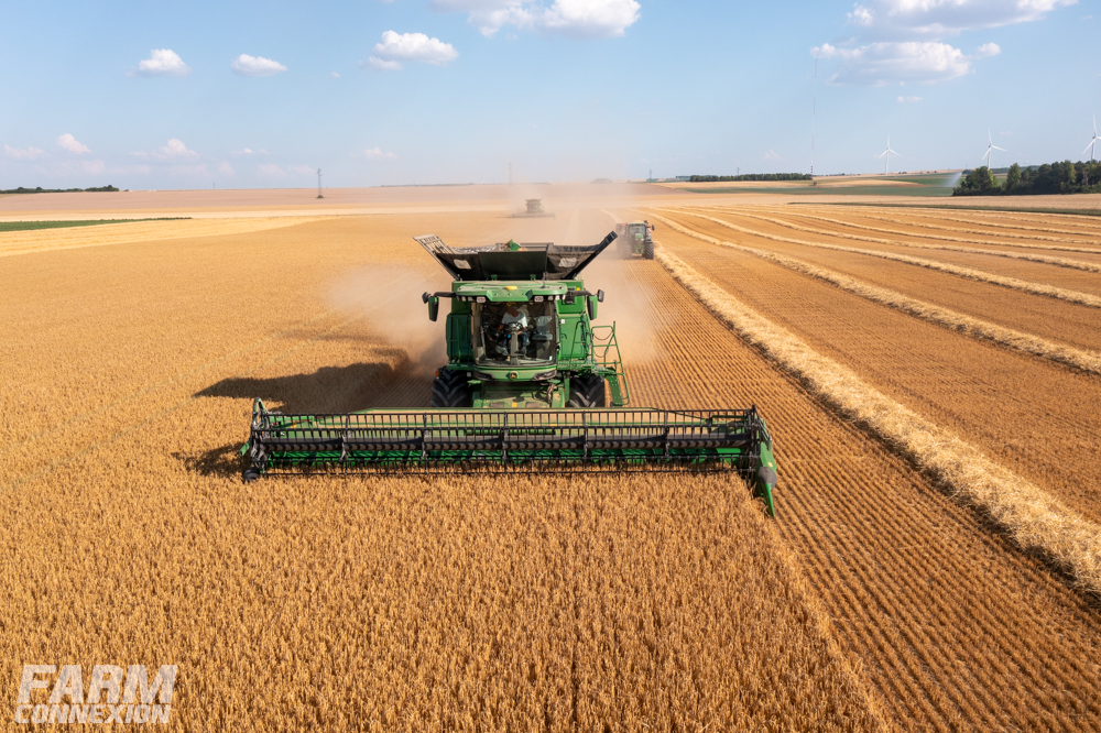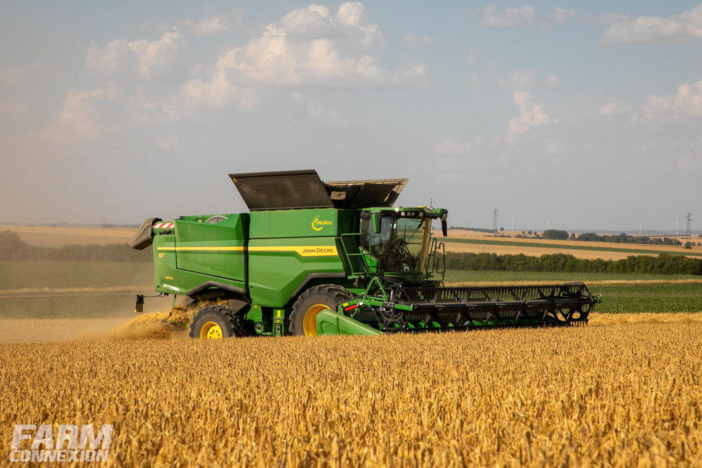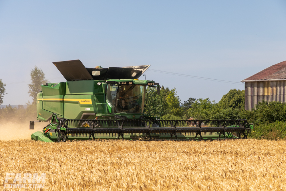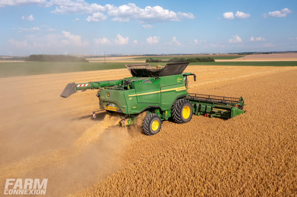 John Deere S7.850, dotée de sa coupe à tablier avancé XA35 de 10,7 mètres.