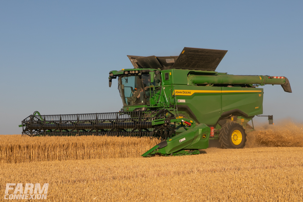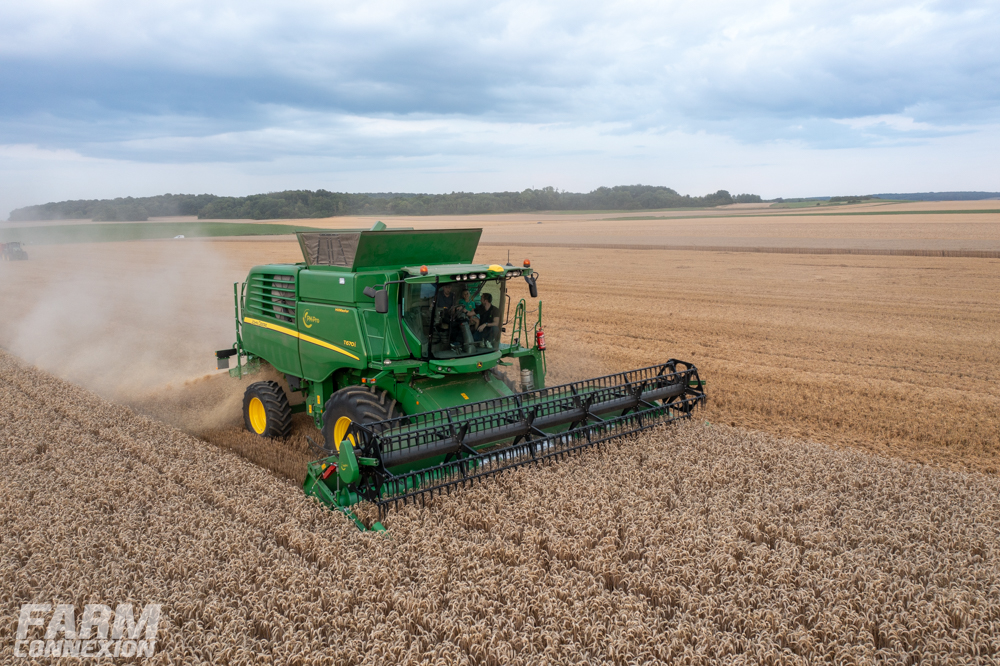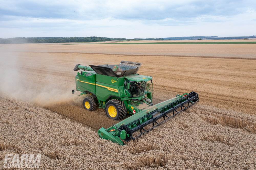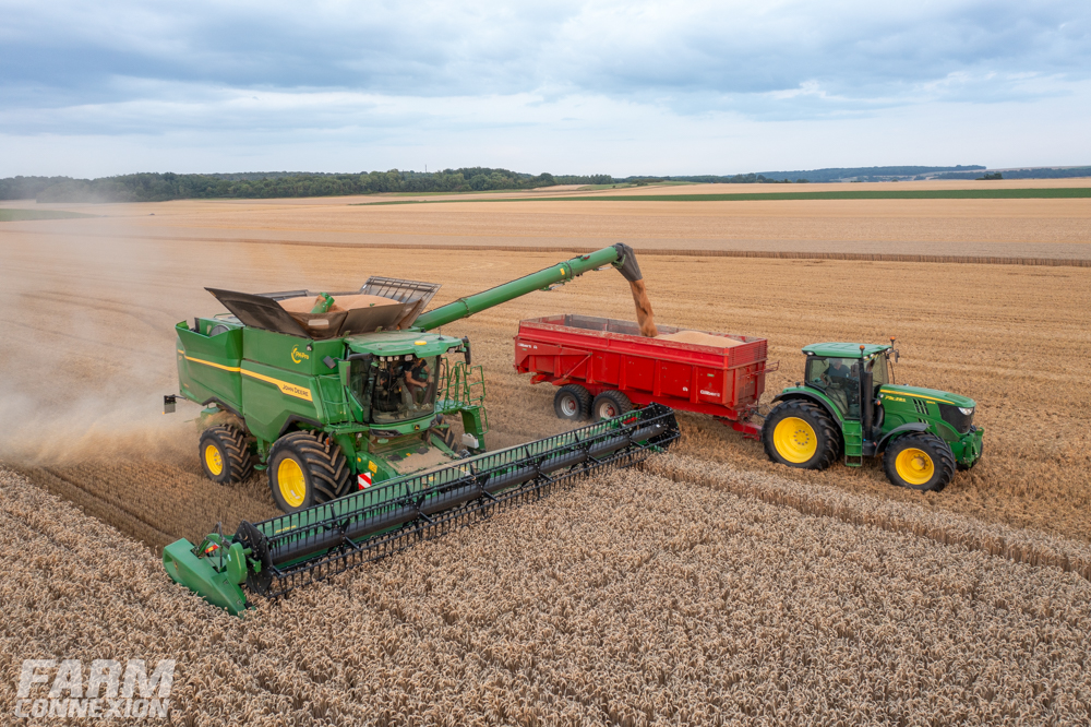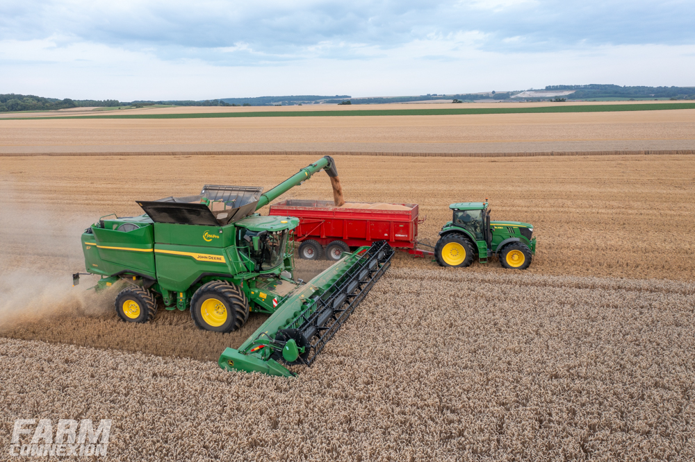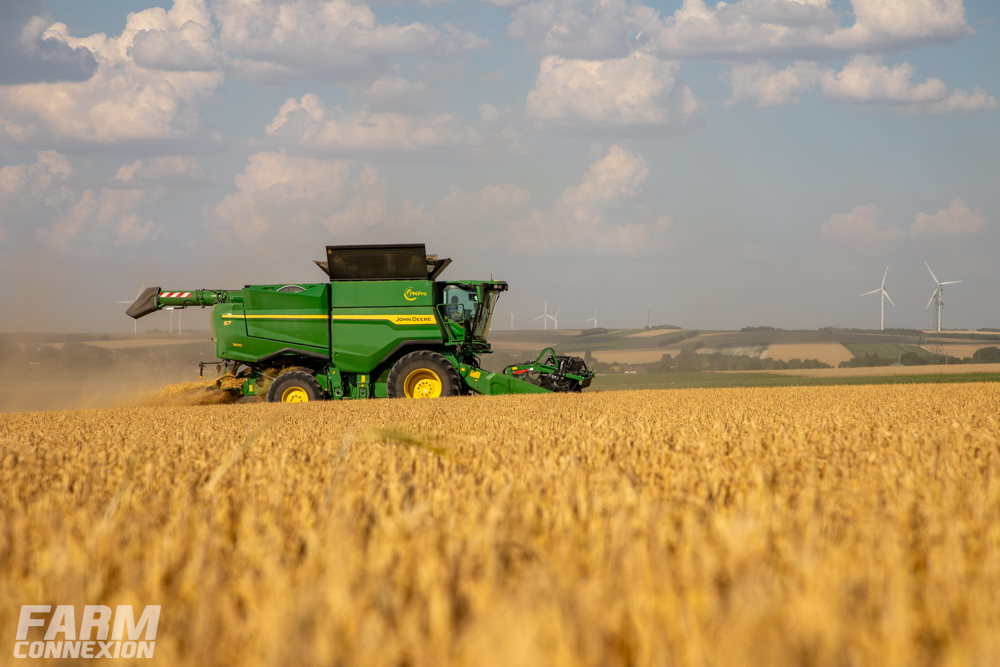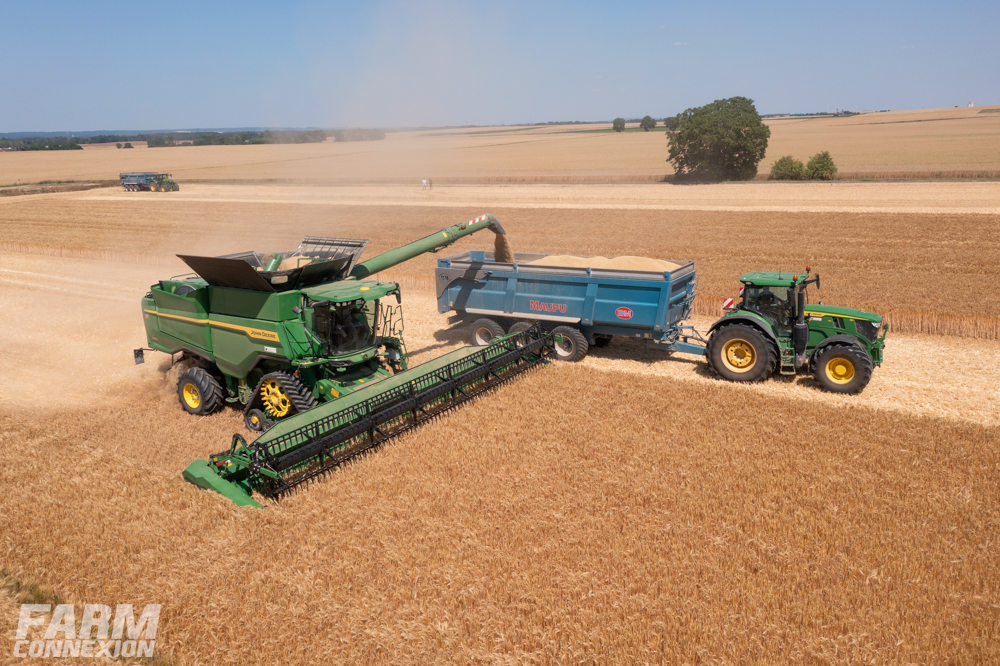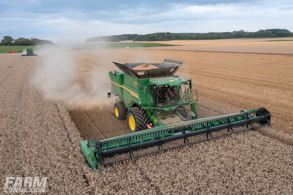 John Deere S7.850, dotée de sa coupe à tablier avancé XA35 de 10,7 mètres.