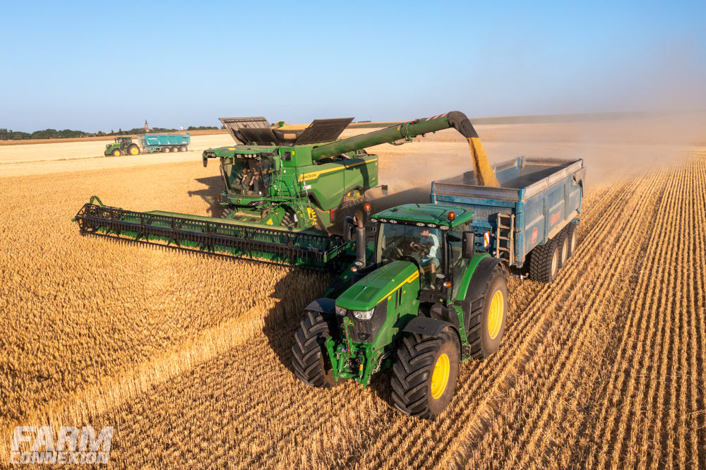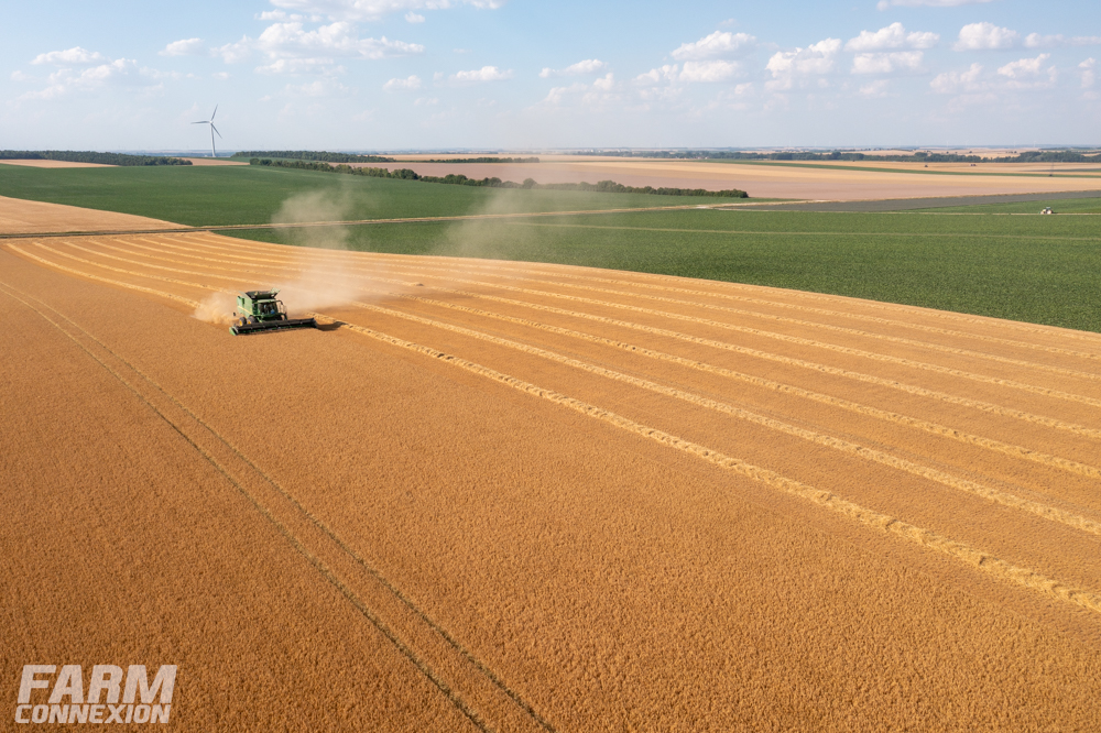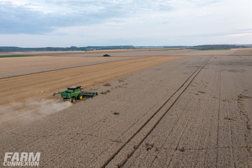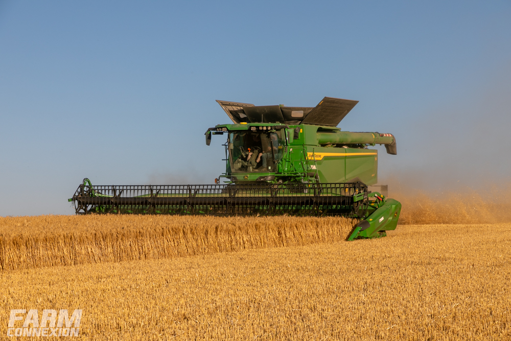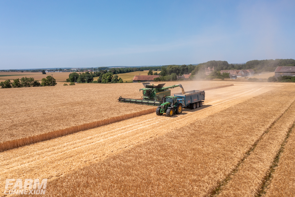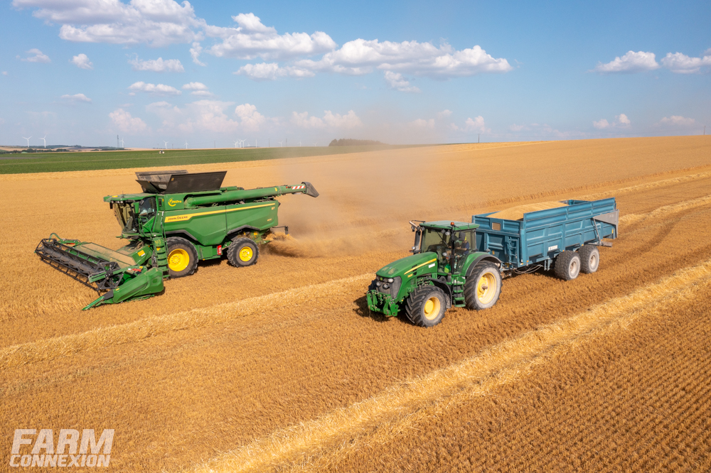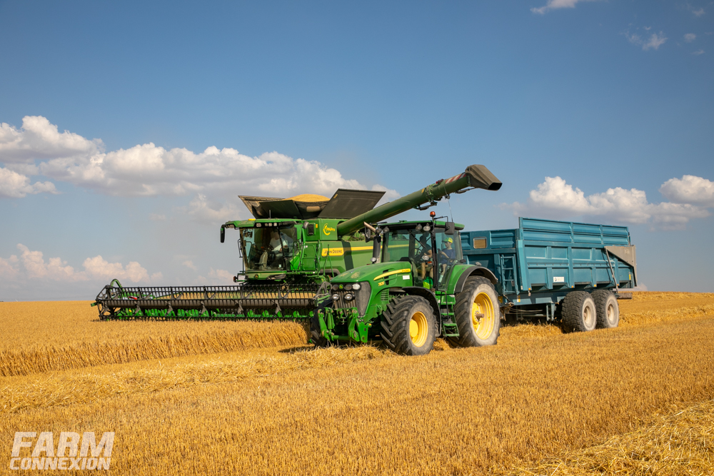 John Deere S7.850, dotée de sa coupe à tablier avancé XA35 de 10,7 mètres.