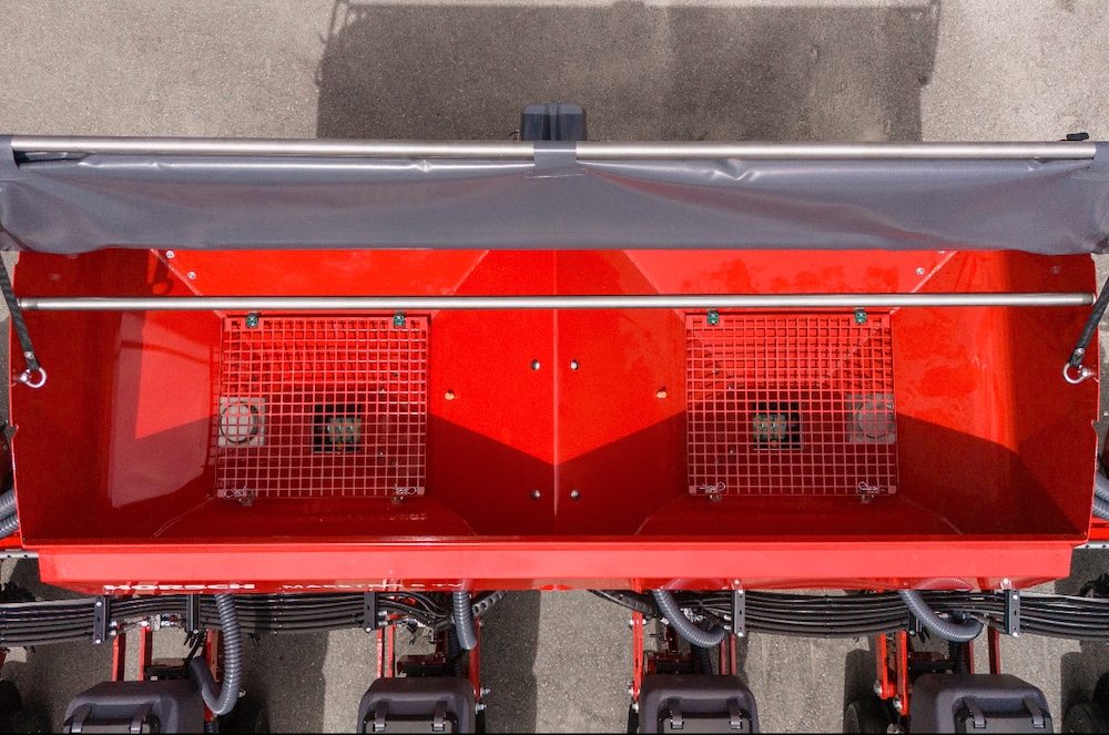 En option, le Maestro TV peut incorporer un troisième produit microgranulé grâce à une cuve de 18 litres positionnée sur chaque rang. Le dosage est réalisé via les rotors spécifiques aux petites graines. Il est également possible de réaliser une coupure rang par rang pour les produits microgranulé.