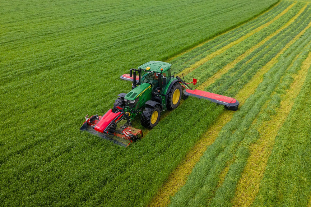 Destiné aux zones pentues, le combiné de fauche Disc A D sera proposé dès 2026 en trois largeurs, de 7,2 – 8 et 8,8 mètres, pour des tracteurs à partir de 100, 110 et 120 chevaux respectivement, 180 chevaux étant un maximum. Ces puissances très raisonnables s’expliquent par une construction des faucheuses robuste mais allégée, et par un centre de gravité le plus rapproché possible du tracteur. En combinaison avec une faucheuse frontale de 3 m, un recouvrement s’opère sur 50 cm par rapport aux deux unités portées à l’arrière, afin de ne laisser aucune chance de retrouver une bande centrale mal coupée. La suspension des barres de coupe arrière est confiée à un jeu de doubles ressorts (un indicateur au niveau de l’attelage permet de contrôler le réglage d’appui au sol retenu). L’angle d’adaptation des lamiers au terrain sur une large plage de -40 à +30 degrés représente un atout pour respecter la parcelle, en particulier sur des terrains au relief défavorable. L’entrainement s’effectue classiquement par prise de force avec un embrayage à friction et à roue libre, puis par 4 courroies à gorge en V. En cas de collision, les barres de coupe sont protégées par le système mécanique-maison CSS, qui propose jusqu’à 11° d’effacement par rapport à l’obstacle. L’opérateur, grâce à deux prises simple effet, peut relever hydrauliquement les lamiers, ensemble ou séparément. Au transport, la largeur après repliage n’excède pas 2,78 m. Les faucheuses de la gamme Disc A D sont livrées d’usine avec un éclairage LED et les plaques réfléchissantes réglementaires.