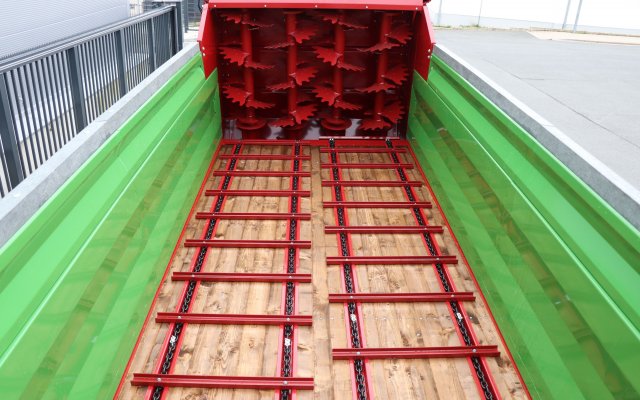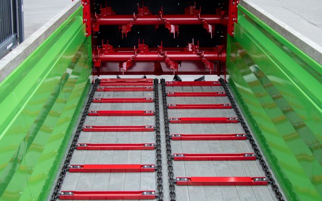 La MS 105 est équipée de série d’un plancher en bois et de quatre chaînes rondes en acier de 10 mm d’épaisseur. La MS 120 est dotée d’un plancher en plastique résistant et de chaînes de 13 mm d’épaisseur. Cet équipement étant également disponible sur demande pour la MS 105. Les grands pignons à six dents réduisent l’usure et augmentent la capacité de charge du plancher racleur.