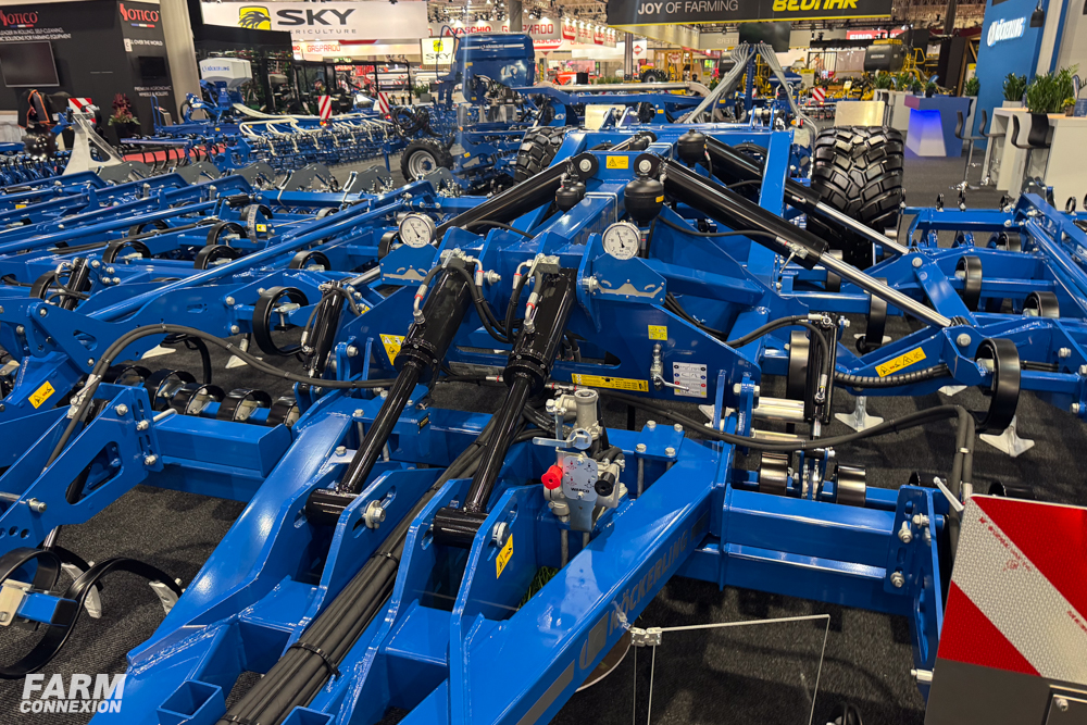 Ces deux déchaumeurs de 9 et 12,3 m reposent sur un châssis articulé en 5 parties, de façon à mieux suivre les irrégularités du sol et 4 rangées de dents Hercules+ (lire l’article). L’écartement est de 16,5 cm.