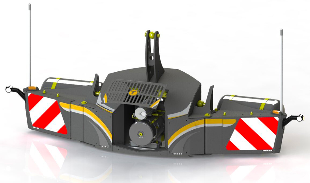 Animé hydrauliquement, le compresseur à palettes logé au centre de la masse, dans un compartiment dédié nécessite un débit de 55 l/min, pour pouvoir délivrer 2.000 l/min d’air. Malgré la greffe de ce système, l’ensemble conserve sa fonction principale, de masse de lestage d’un poids de 600 kg avec ses extensions articulées et son fameux système de protection anti-retour intégré qui en cas de choc évite à un éventuel véhicule percuté de s’encastrer dans le tracteur.