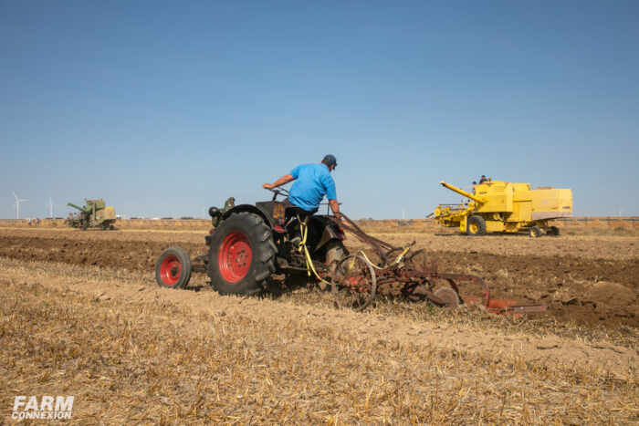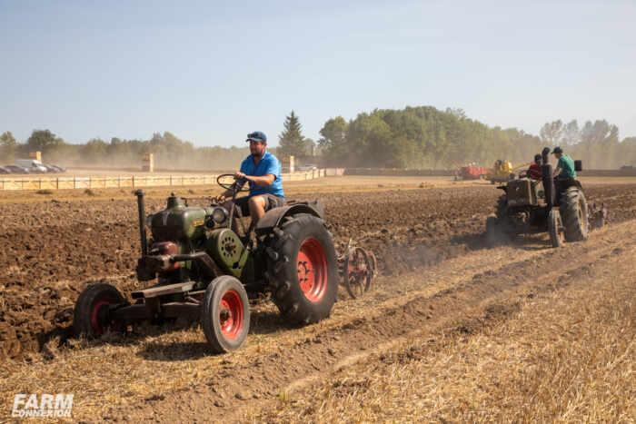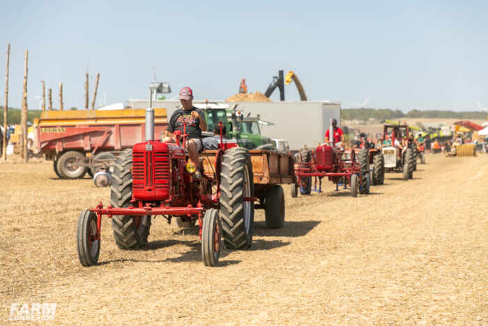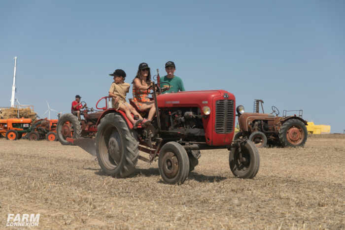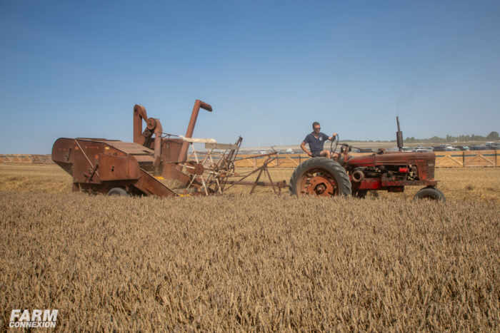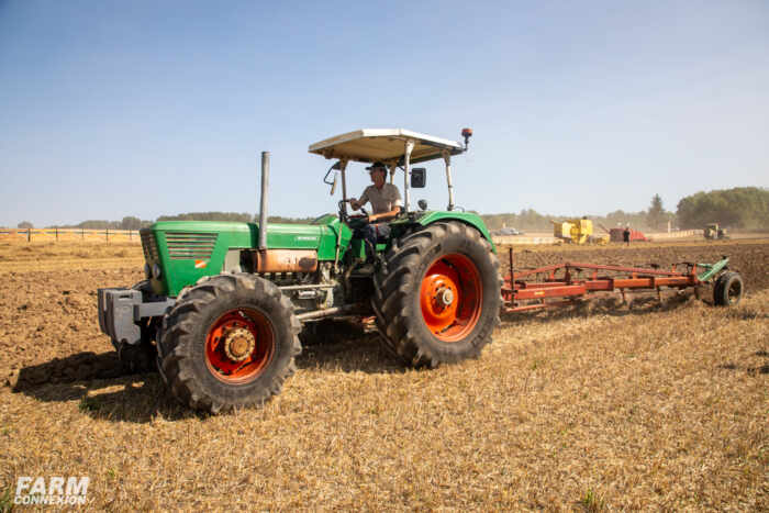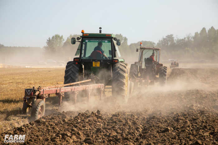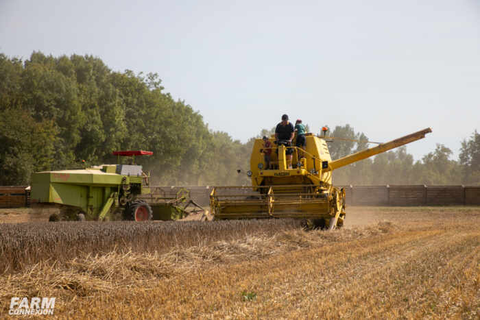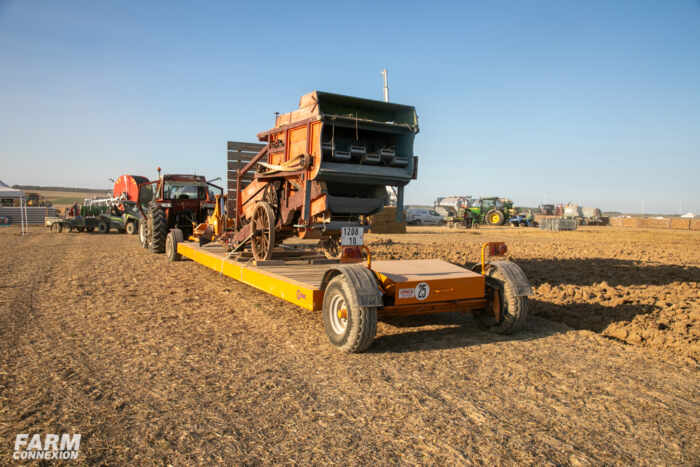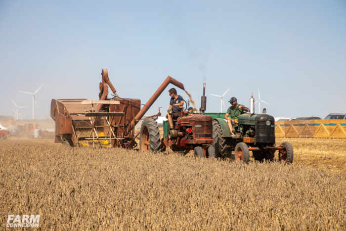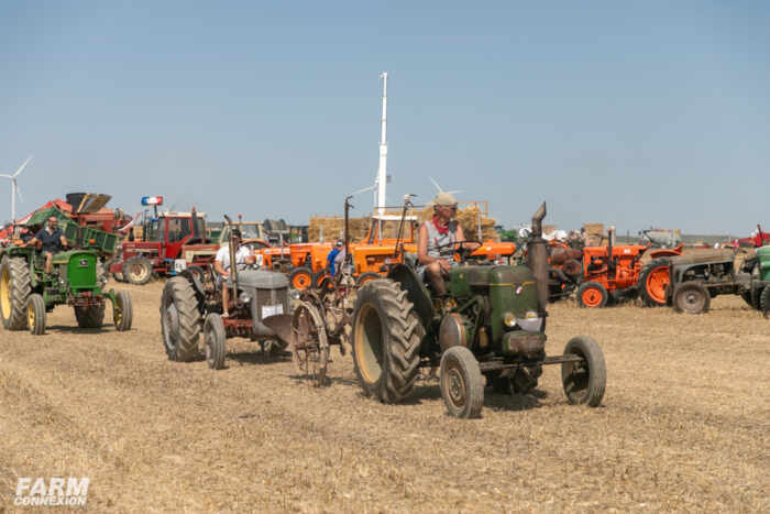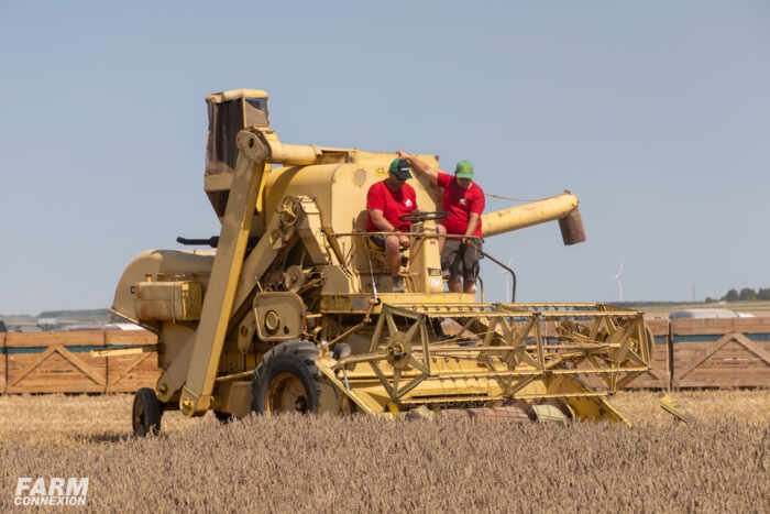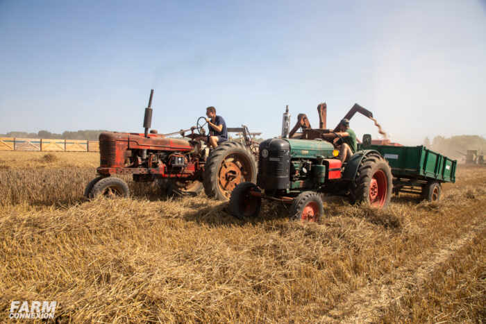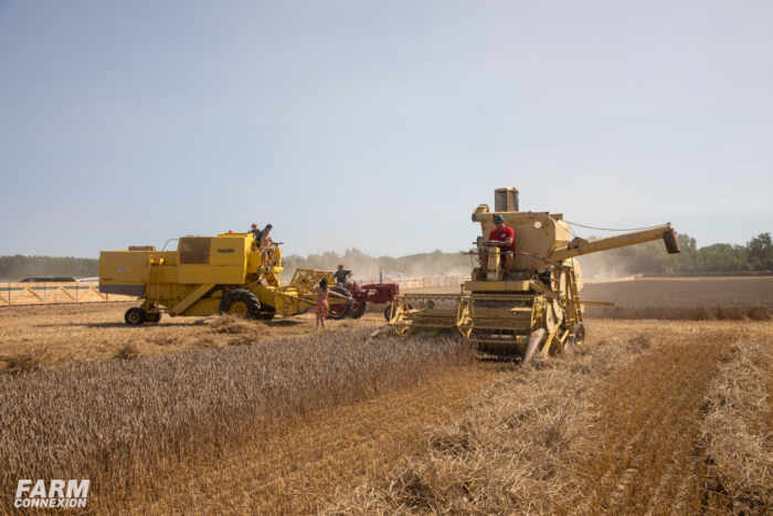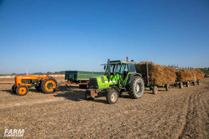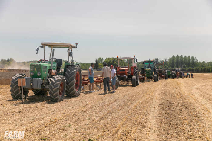 Malgré un petit incident technique rvite maitrisé, l’armada de ces machines produites pour la plupart entre le début des années 50 et la fin des années 60 a pu récolter un blé déjà bien mûr compte tenu de la précocité des moissons cette année. Alors que les gerbes laissées par les moissonneuses lieuses sont expédiées vers une batteuse Merlin à poste fixe, les presses moyenne densité entrent en action et ont rapidement laissé le terrain nu pour que la team des Teuf’teufeurs, bien connue localement pour son intérêt pour les charrues en planche n’intervienne.