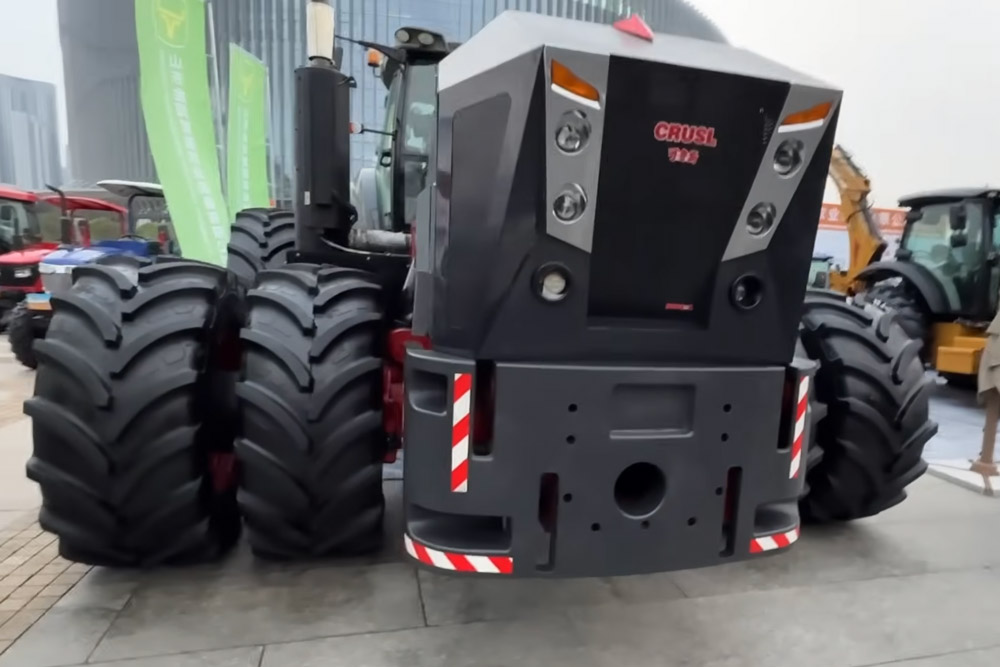 Cependant, nous n’avons pas été assez loin dans le temps, ni dans les allées du salon, pour trouver le graal. S’avance alors une forme cubique noire. En grosses lettres rouges, « CRUSL » apparaît : un nom encore méconnu qui espère cocher toutes vos cases. Une cabine de taille modeste rappelle celles utilisées pendant des décennies par Massey Ferguson. Sur le pupitre publicitaire, entre sinogrammes, on distingue 500 chevaux, une boîte mécanique à 64×32 vitesses automatisées couvrant une plage de 156 m/h à 55 km/h. Bien que l’empattement ne soit pas précisé, il rivalise avec celui d’une locomotive. Prévoyez quelques largeurs de plus pour vos fourrières. On aperçoit un châssis renforcé, des ponts robustes et des réservoirs de fluides dont la conception ne vise aucune recherche esthétique. C’est pratique. Point.