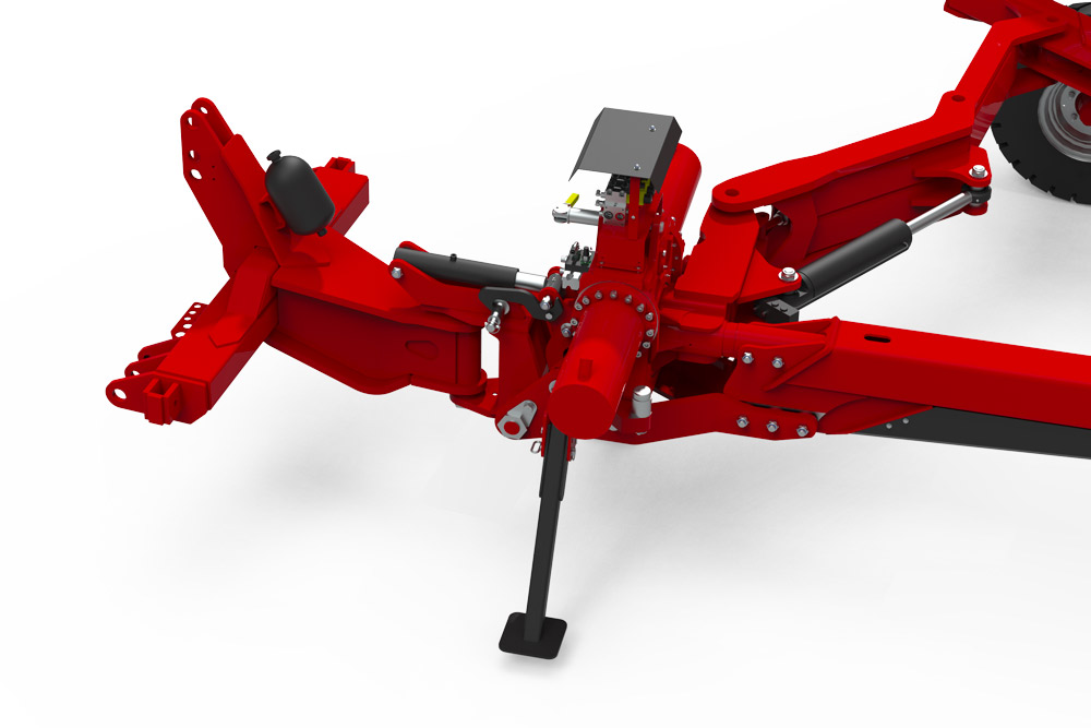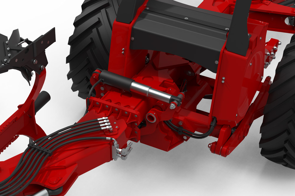 Le système de retournement par pignon-crémaillère assure une rotation fluide, régulière et parfaitement maîtrisée de la charrue. Plus précis et plus robuste, il réduit les à-coups lors des demi-tours et limite les contraintes sur la structure comme sur le tracteur. L’assistance hydraulique au retournement intégrée au chariot facilite les manœuvres et apporte une grande souplesse d’utilisation. Associé à une suspension sur le chariot et sur l’articulation, il absorbe les chocs et vibrations, offrant une conduite plus douce et plus stable, que ce soit au champ ou sur route.