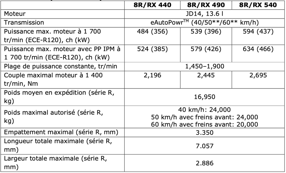 Comme nous vous l’annoncions il y a quelques semaines, le constructeur américain travaillait lui aussi sur un tracteur conventionnel très puissant, dont le cahier des charges imposait davantage de polyvalence face à ses colosses articulés. Extension des gammes 8R et 8RX actuelles, les trois modèles délivrent 440, 490 et 540 chevaux de puissance nominale, soit 484, 539 et 594 chevaux max à 1.700 tr/min et même 524, 579 et 634 chevaux avec la surpuissance (Peak Power Intelligent Power Management) active. Ayant trouvé les limites de son 6 cylindres de 9 litres avec le 8R410, John Deere a opté pour son 13,6 litres maison – le JD14 – pour déployer une puissance encore jamais atteinte sur un tracteur traditionnel de série, et pouvoir délivrer jusqu’à 2.695 Nm de couple maximal, tout en offrant une plage de puissance constante de 1450 à 1900 tr/min.