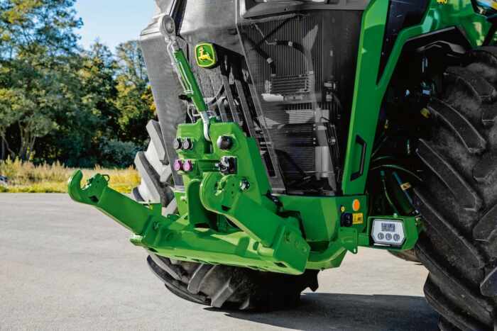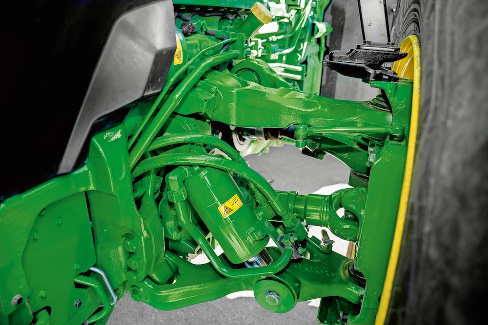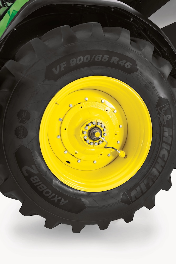 Pour transmettre une telle puissance, deux choix s’offrent aux utilisateurs. Pour les 8R, des pneumatiques allant jusqu’à 2,30 m à l’arrière et 1,85 m à l’avant, en monte simple ou jumelées jusqu’à 710 mm de largeur peuvent être équipées du système de télégonflage intégré John Deere (CTIS) à conduite unique, qui ajuste automatiquement la pression des pneus à n’importe quelle vitesse et à n’importe quelle température. Sa conception simplifiée permet au moyeu d’essieu d’intégrer des composants d’étanchéité renforcés, couverts par le contrat de garantie PowerGard.