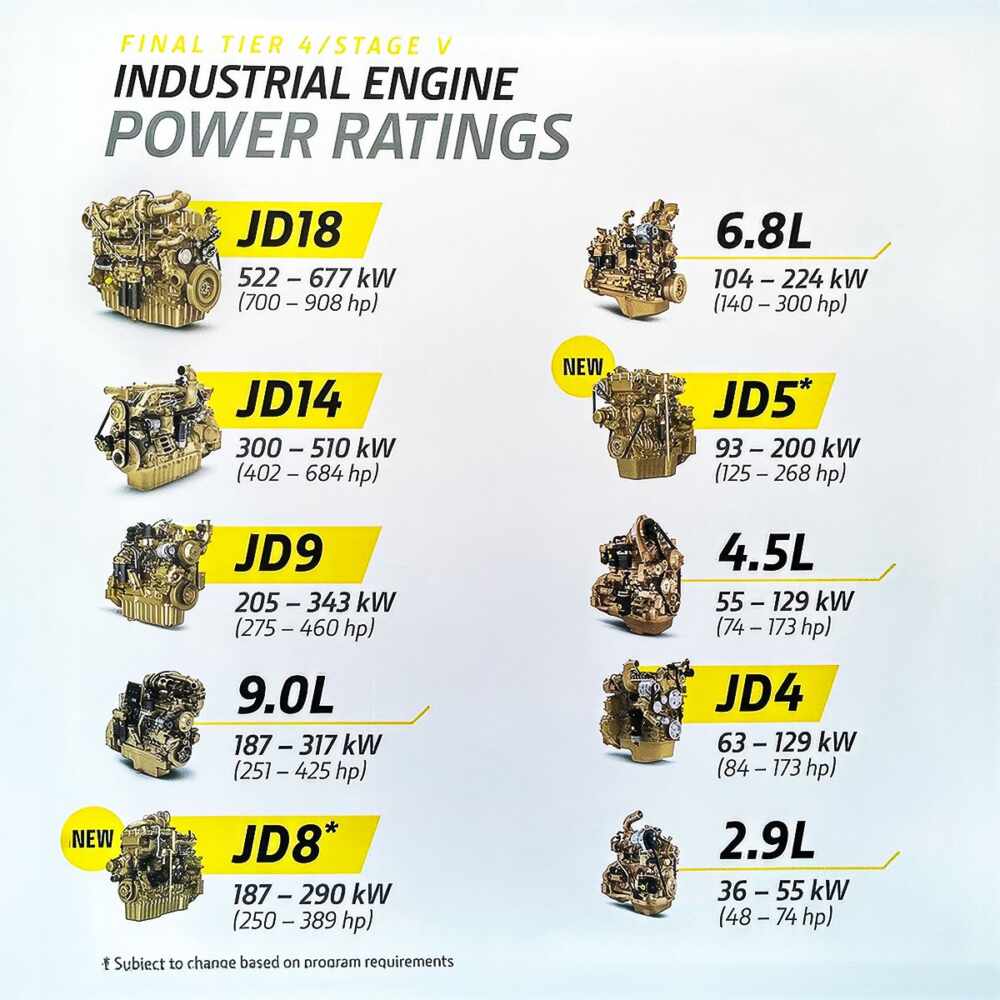 Le moteur JD5 de 5,0 litres est un quatre cylindre turbocompressé qui offrira une puissance comprise entre 125 et 268 ch (93 à 200 kW), tandis que le 6 cylindres turbocompressé JD8 de 7,5 litres offrira une puissance comprise entre 250 et 389 ch (187 à 290 kW). Ces deux moteurs évolutifs seront compatibles avec les carburants diesel renouvelables et les mélanges de biodiesel, et pourront s’adapter à d’autres carburants renouvelables en fonction de l’évolution du marché.