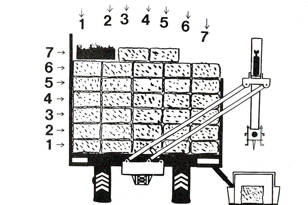 Pour le conducteur, il suffit de rouler parallèlement aux rangées de balles et d’enfiler les rangées de balles dans un canal, qui a pour mission de les aligner plus précisément et d’éviter la présence de trous, que l’on retrouverai dans le chargement final. Une fois le canal rempli, le mécanisme saisit les balles grâce à des griffes et les positionne dans la remorque grâce au bras de chargement commandé par l’hydraulique du tracteur via des distributeurs.