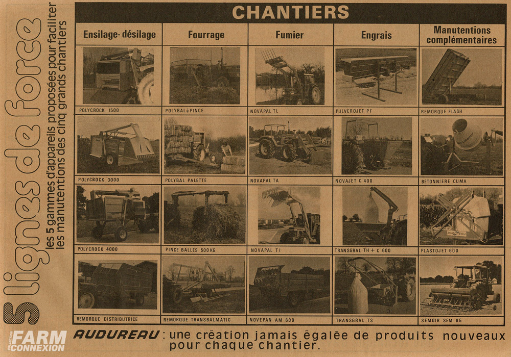 Intégré au groupe Kuhn en 1993, pour devenir le département spécialisé à l’élevage et à l’entretien du paysage le Vendéen, Audureau était autrefois un constructeur très diversifié dans ses produits (photo de l’offre proposée en 1980 en bas d’article). Semoirs, lève-sacs, chargeurs, épandeurs d’engrais, bennes, bétonnières, pulvérisateurs, épandeurs à fumier côtoyaient les désileuses-pailleuses et distributrices qui ont fait la renommée de l’entreprise. L’offre très orientée « polyculture-élevage » s’était diversifiée dans le courant des années 70 avec la création d’une gamme destinée à la manutention des balles rectangulaires et de moyenne densité. Mais avec l’évolution des attentes et la quête de productivité et de sécurité dans le domaine agricole, il faut constamment se réinventer. Audureau imagine alors la Transbalmatic au tournant des années 80, une remorque de chargement de balles qui ne nécessite plus qu’un seul conducteur pour charger près de 200 balles par voyage.