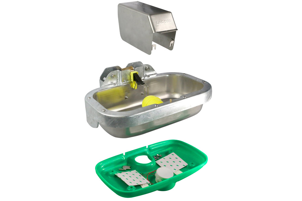 Son bol en inox de 16 litres est protégé par une épaisse cornière d’acier galvanisé, le LAC 550 offre deux larges accès à l’eau (19×27,5 cm) et un rebord anti-lapage adapté à tous les bovins quel que soit leur âge. De multiples possibilités de fixation murale sont offertes, sur poteau ou pilier IPN de toutes dimensions permettant une installation sans emprise au sol. La robinetterie à niveau constant de 25 l/min (à 3 bar) est munie de série d’un T ¾” autorisant un raccordement en boucle hors gel. Un bouchon vissé permet le vidange de l’abreuvoir. Un kit antigel électrique (70W/24V) est également disponible pour protéger la réserve d’eau et est protégé par un capot en PE (option).