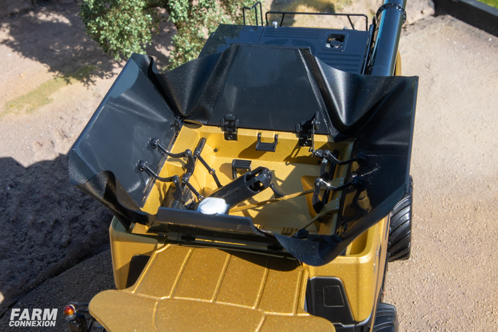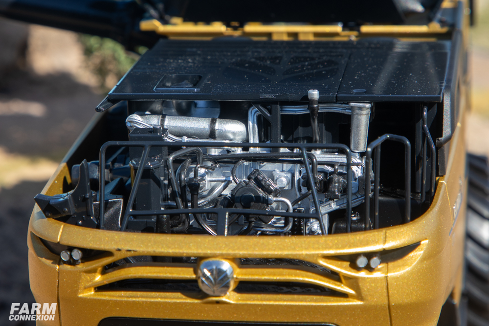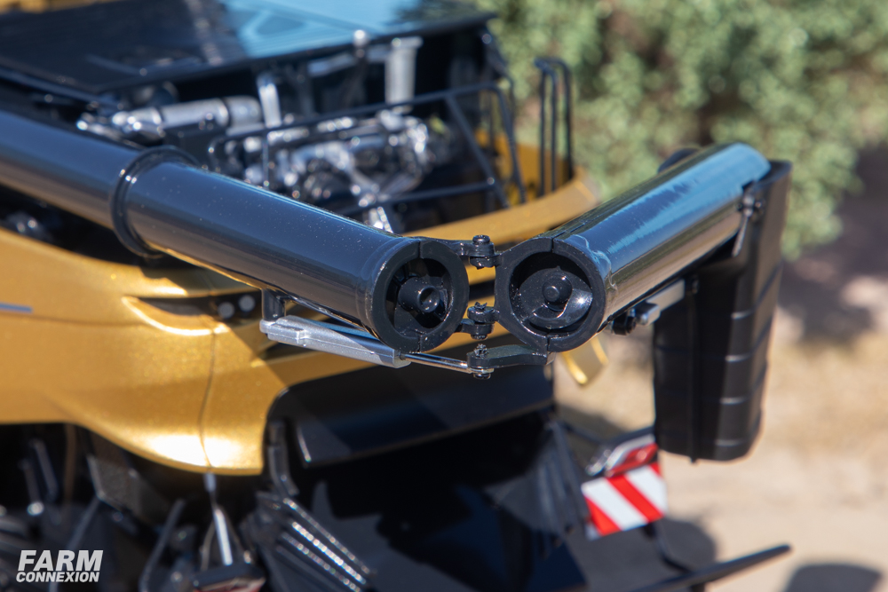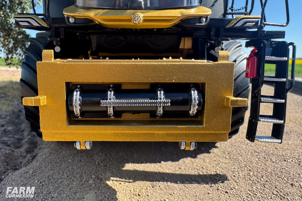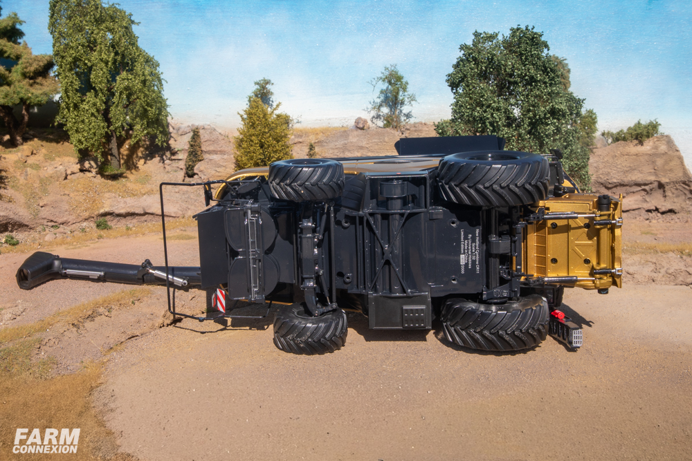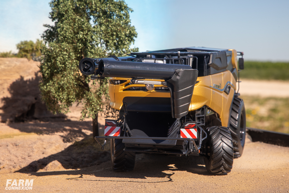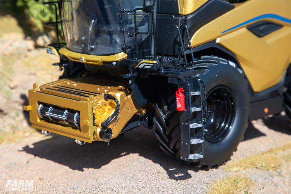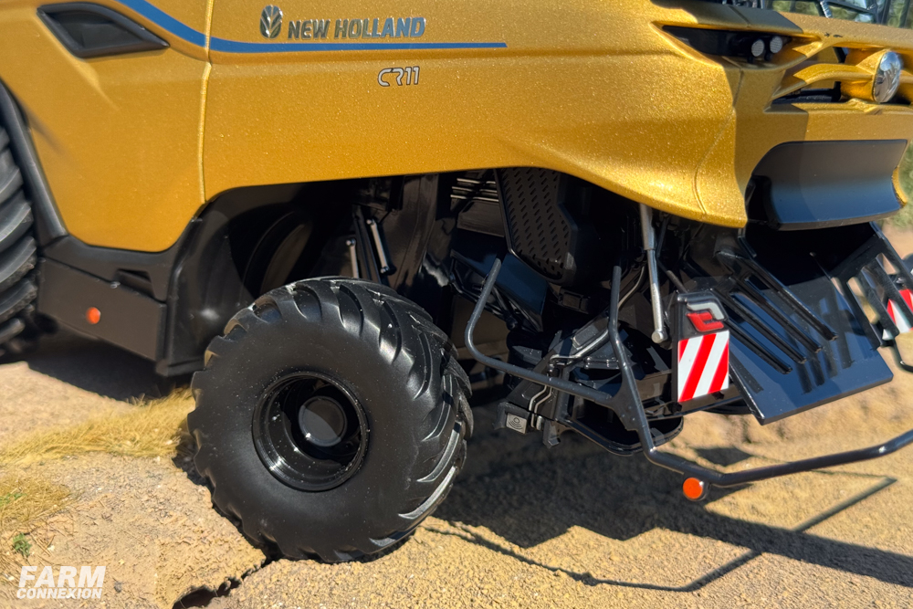 A l’image du modèle grandeur nature, la CR11 UH impressionne par sa stature. Sa ligne élancée, son style moderne et le choix des couleurs rendent ce modèle unique. C’est aussi parce qu’elle se chausse non pas de chenilles mais de grandes roues de 2,32 mètres de diamètre, assez peu fréquentes sur une machine de telles dimensions et d’un poids aussi conséquent. Celles-ci ont été développées avec Michelin dans le but d’offrir une alternative aux chenilles caoutchouc, tout en supportant le poids élevé de la machine (26 tonnes), ses 20.000 litres de récolte en trémie et sa barre de coupe de 12,5 à 18 mètres.