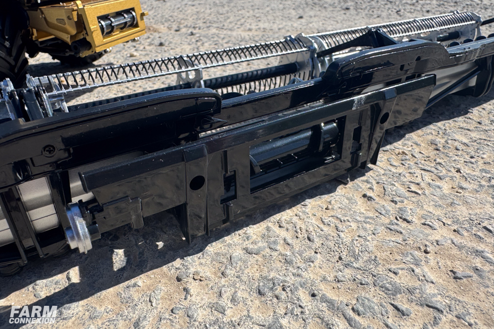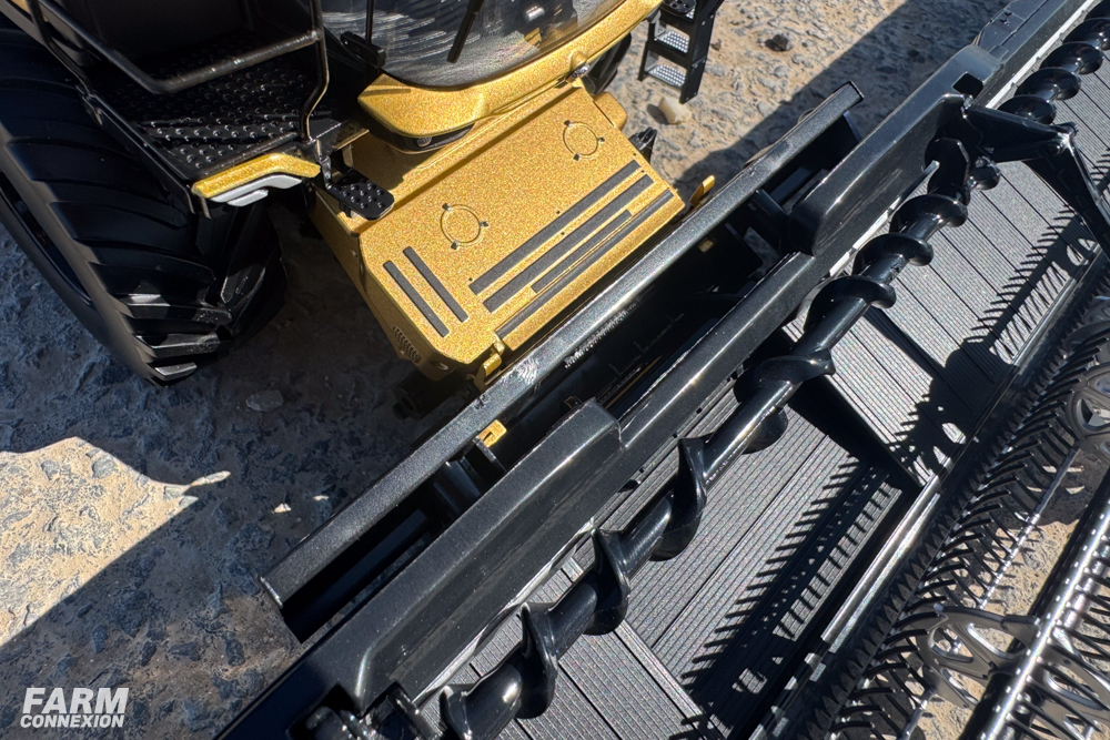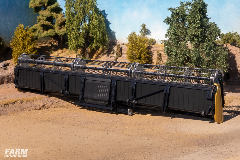 D’origine canadienne, cette MacDon FD250 est du type Flex Draper, donc à tablier flexible capable d’épouser les irrégularités du sol. Dans la série 200, elle est dotée d’une largeur de 50 pieds, soit 15,2 mètres. Ce n’est pas la plus large proposée par MacDon ou New Holland puisqu’il existe un modèle de 18,5 mètres (lire l’article). La miniature est pourtant conçue rigide avec des tapis en plastique dur et non caoutchoutés. UH a forcément dû faire des concessions à un moment donné pour ne pas impacter davantage le prix. Plutôt plastique, la barre de coupe pourrait dénoter devant la moissonneuse, mais lorsque l’on prête attention aux rabatteurs et à leur doigts fins et plutôt réussis, on relativise.