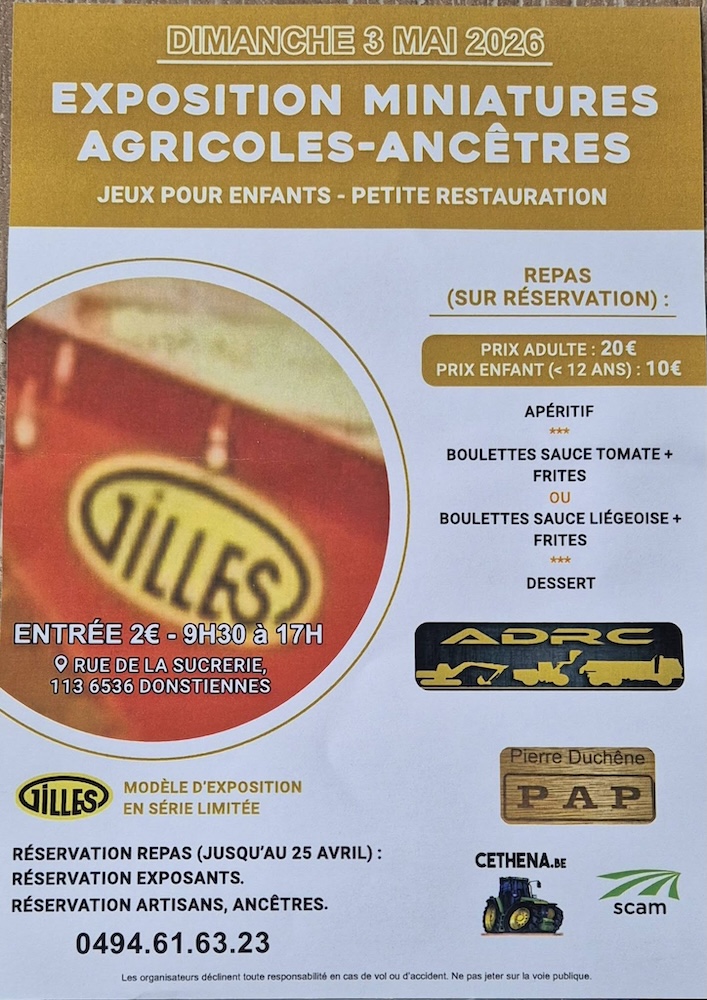 | 03/05/26 | Exposition miniatures agricoles / Balade de vieux tracteurs | Donstiennes (Belgique) | ![]() |